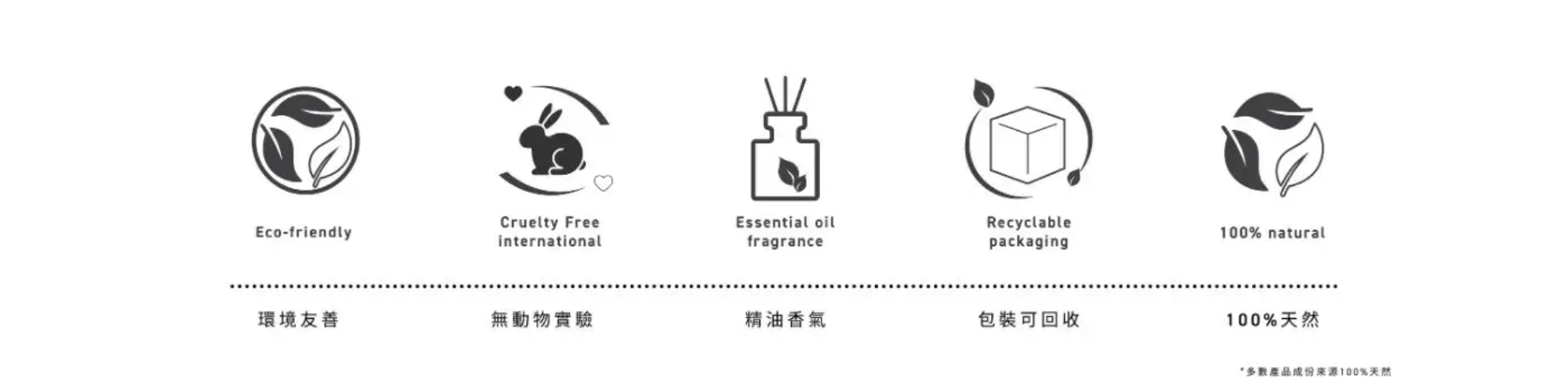 全產品系列絕不含人工香精、硫酸鹽、三濾沙、TEA/DEA、SLS、SLES、Paraben、Phenoxyethanol、MI、 PEG 等可能對人體造成刺激的成分,而且僅採用食品級的防腐劑。