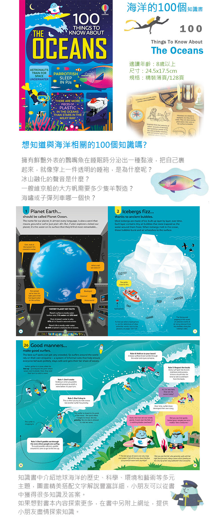 書中介紹各種有趣的海洋知識,最後還有附上單字解釋和網路連結,可上網了解更多海洋知識,非常適合對外太空充滿好奇心的小朋友閱讀。
