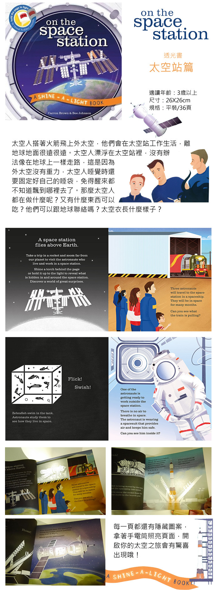 知識就在精彩的繪本中,藉由特殊的透光設計,拿手電筒照亮頁面背後就會有驚喜出現,一邊玩遊戲,一邊閱讀,看到隱藏在書本裡的圖案,讓小朋友自然的愛上閱讀!