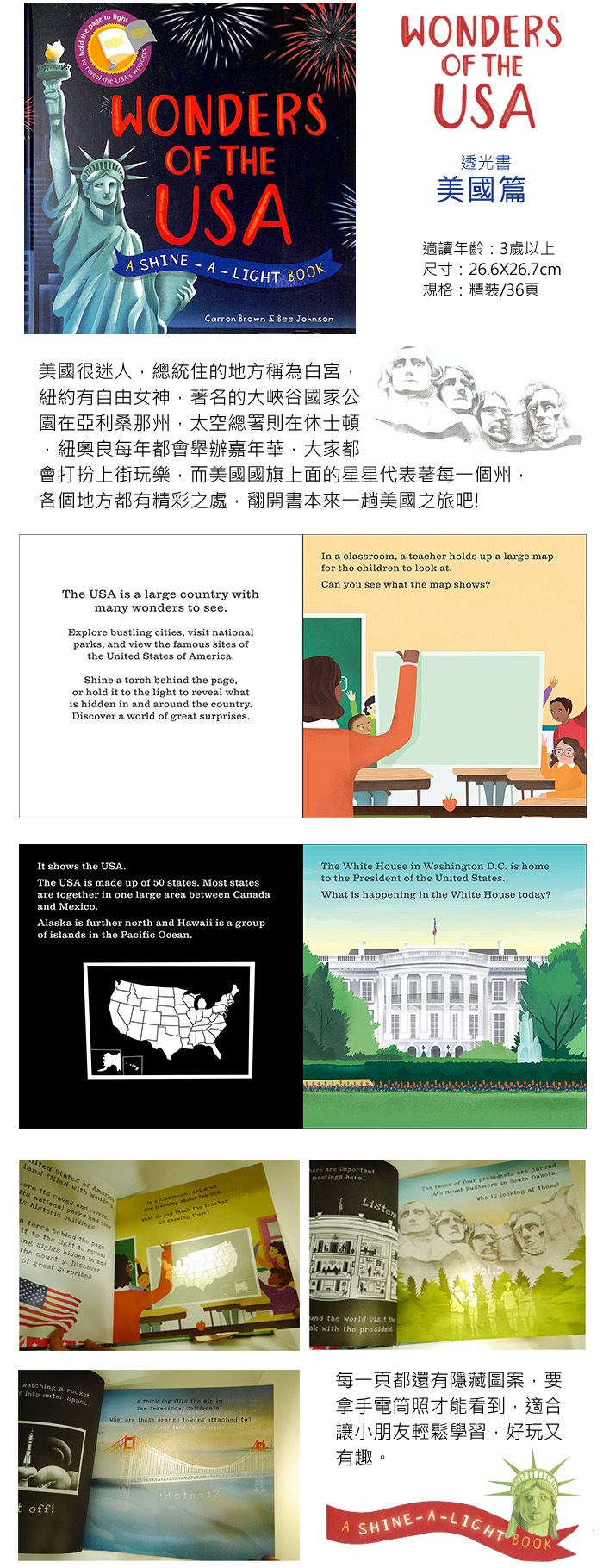 知識就在精彩的繪本中,藉由特殊的透光設計,拿手電筒照亮頁面背後就會有驚喜出現,一邊玩遊戲,一邊閱讀,看到隱藏在書本裡的圖案,讓小朋友自然的愛上閱讀!