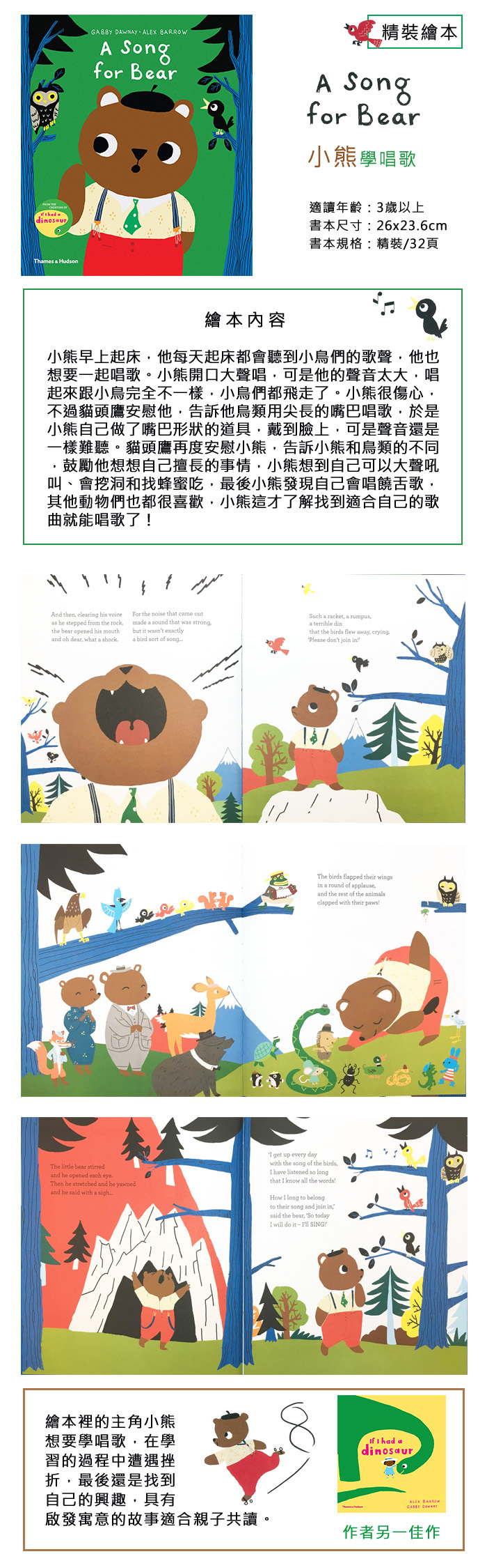 繪本裡的主角小熊想要學唱歌,在學習的過程中遭遇挫折,最後還是找到自己的興趣,具有啟發寓意的故事適合親子共讀。
