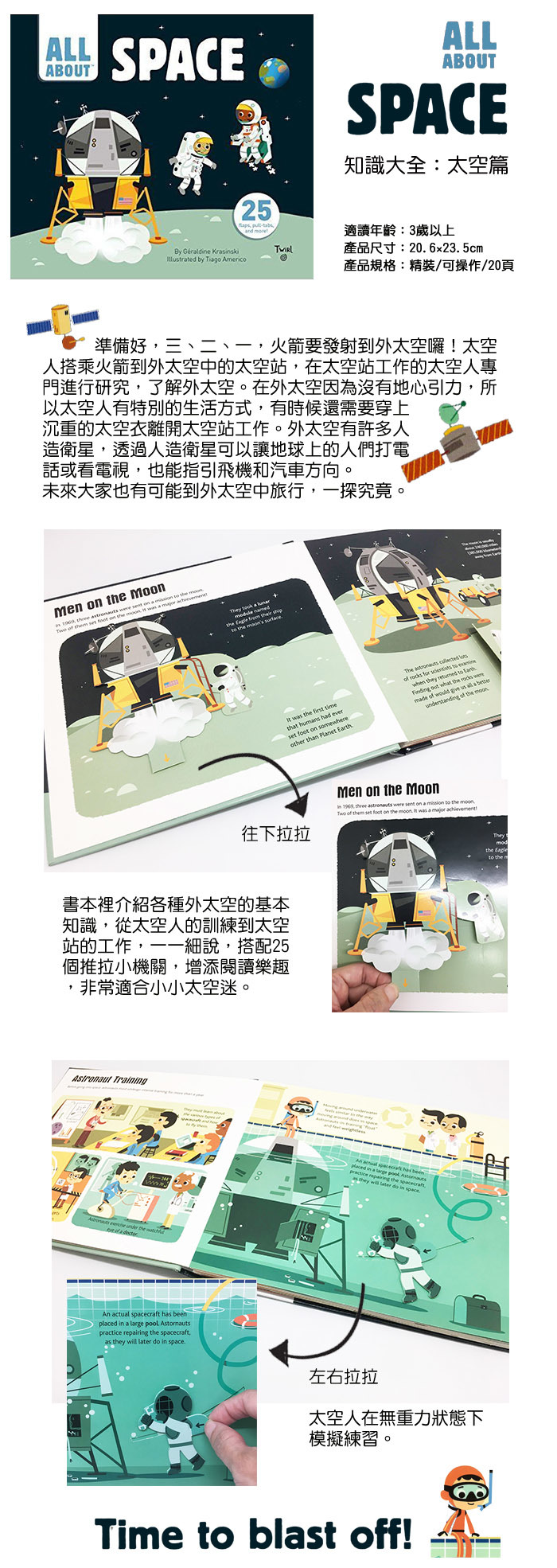 書中介紹各種外太空的基本知識,從太空人的訓練到太空站的工作,一一細說,搭配25個推拉小機關,增添閱讀樂趣,非常適合小小太空迷。