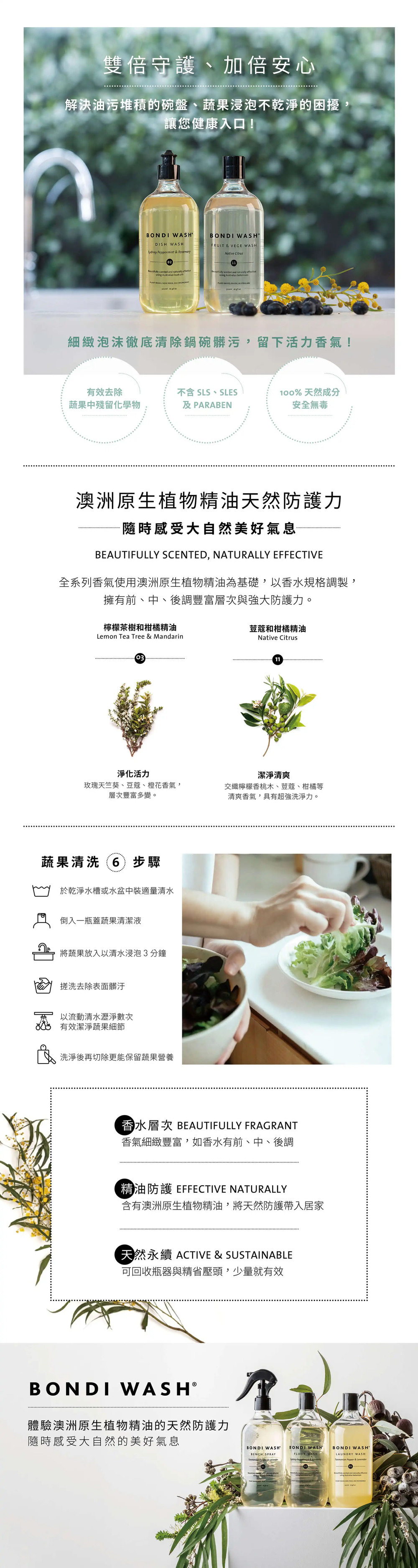 使用天然的介面活性劑及澳洲原生植物精油,細緻泡沫能徹底清除鍋碗髒污並留下活力香氣。
