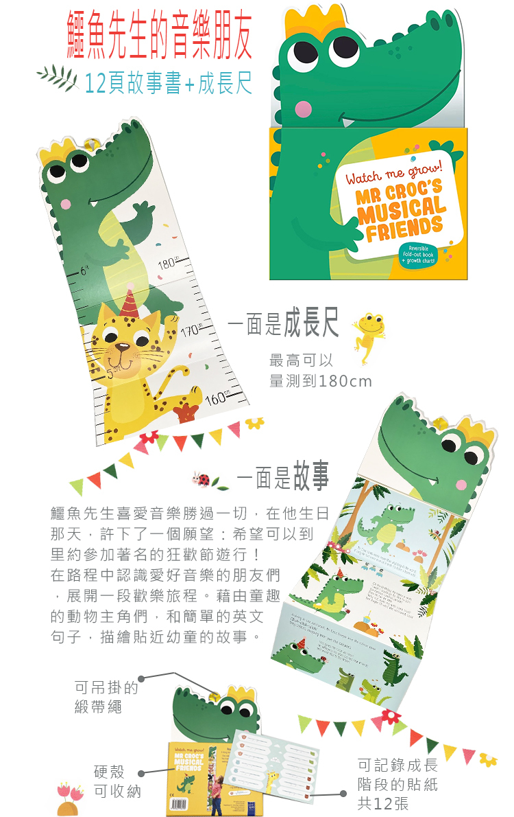 二合一的書本中,一面是鱷魚認識喜歡音樂朋友的故事,另一面是記錄身高的成長尺,陪伴幼童快樂長大!