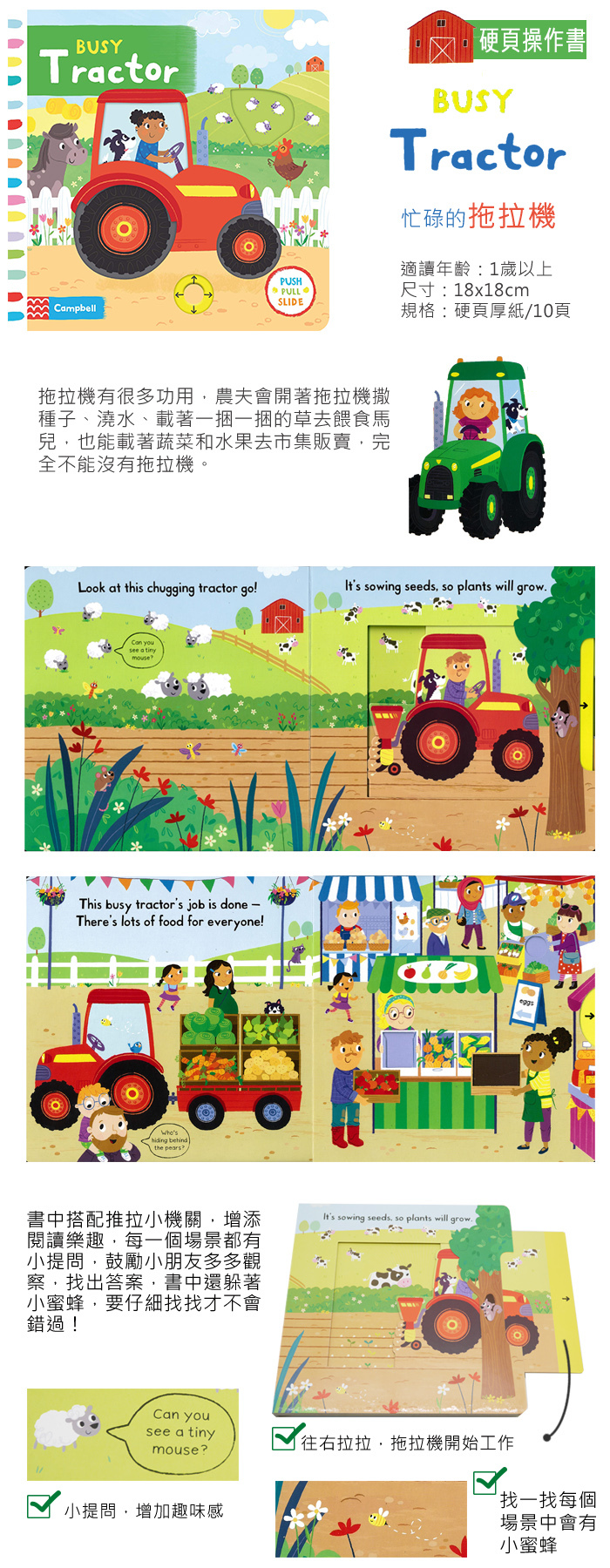 圖文設計豐富易懂圖像可愛,幼童藉由推、拉和轉動的過程中,促進手指靈活與發展,是具吸引力又有趣的啟蒙書。