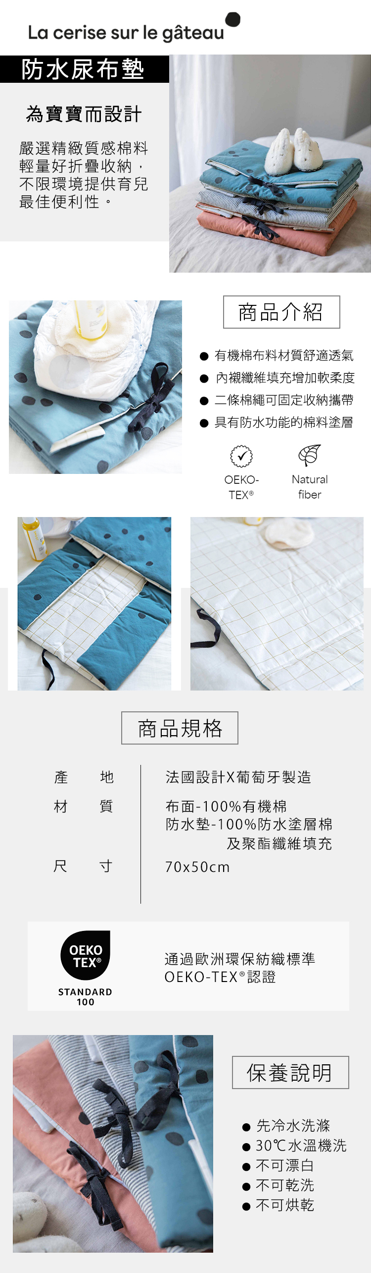材質:正面-100%有機棉、背面-100%防水塗層棉、聚酯纖維填充