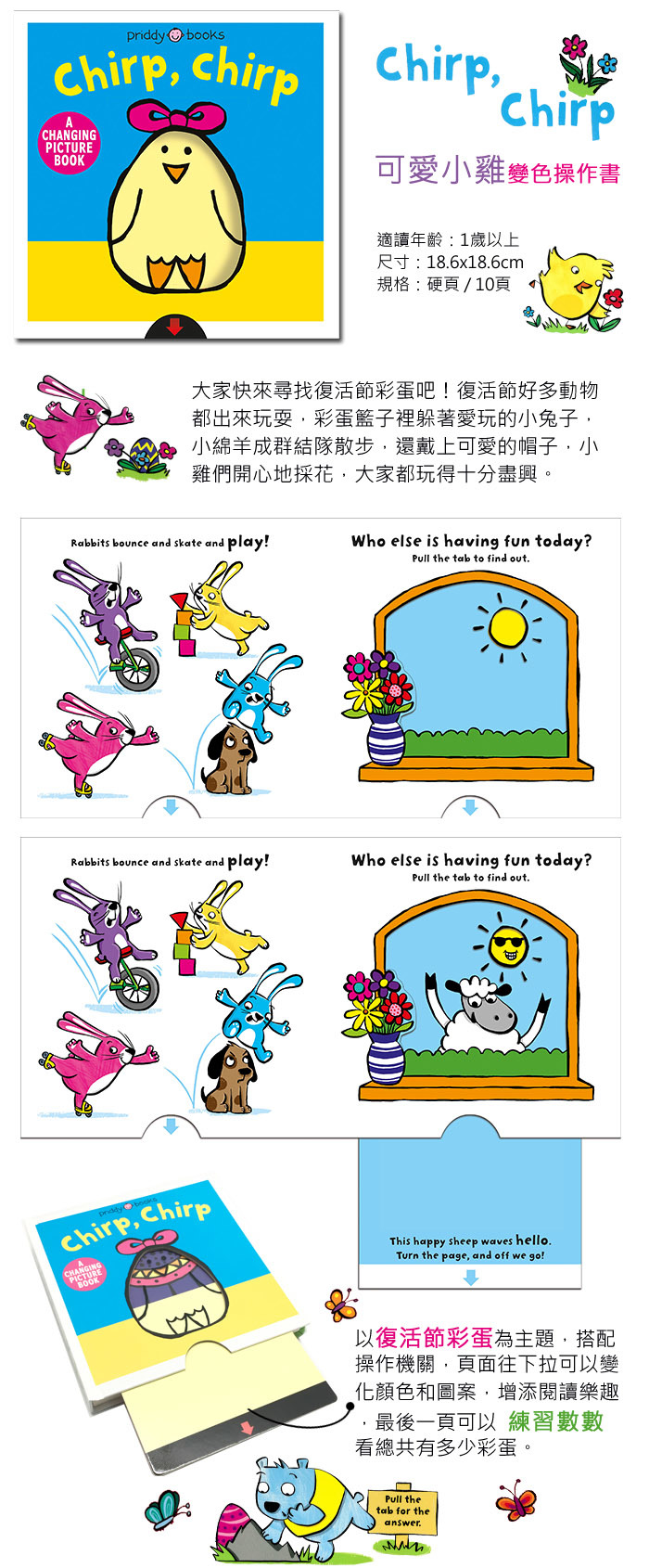 學習基本的概念認知,利用顏色紙板的推拉操作,加深幼童的學習印象,在玩樂中讓閱讀更輕鬆活潑。