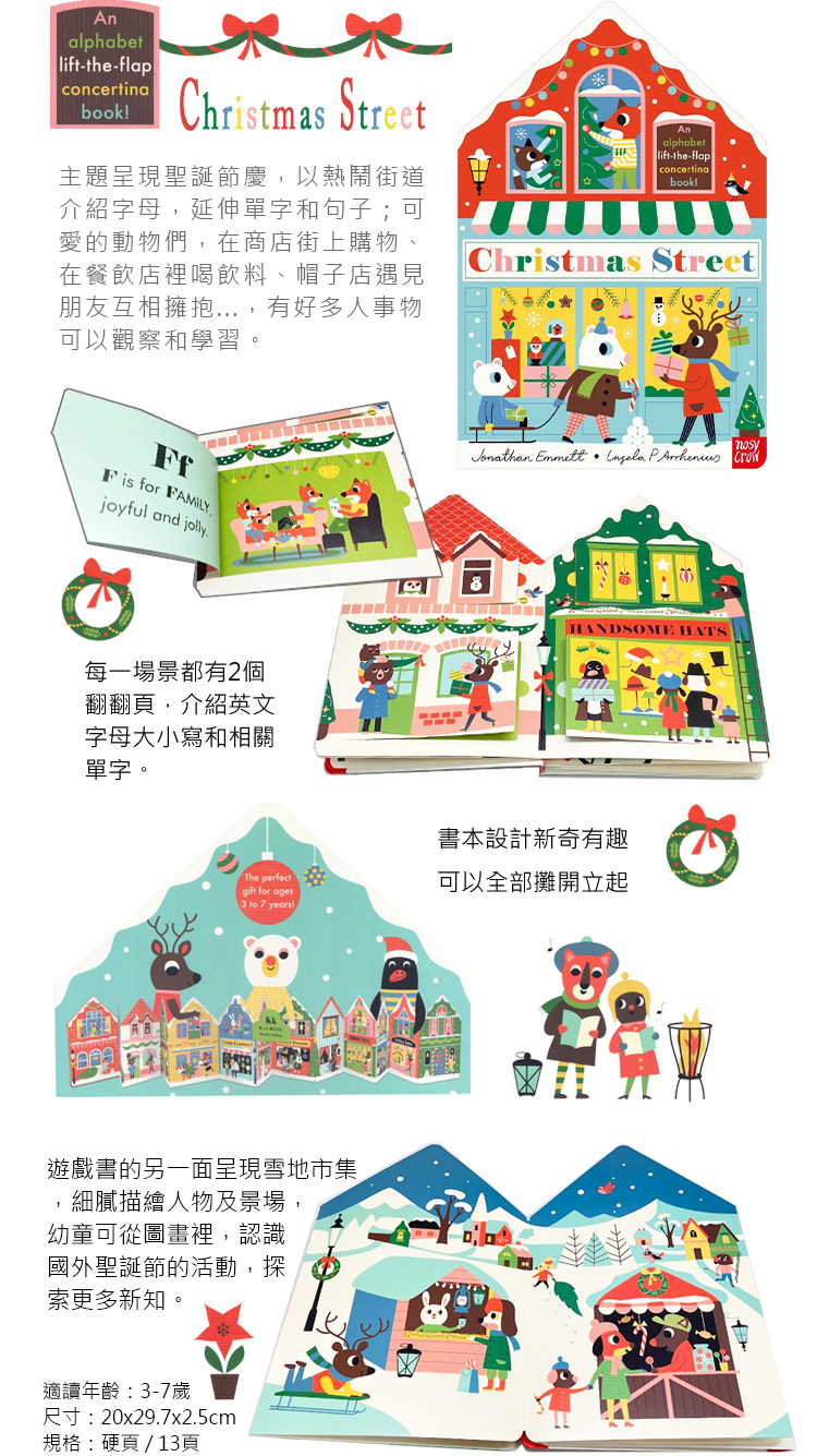 新奇的商店街造型設計,以圖像及翻翻頁加深印象,有別於傳統書本,可展開變成一面聖誕節的街景,另一面是熱鬧的雪地市集場景,是一本豐富有趣的遊戲書。