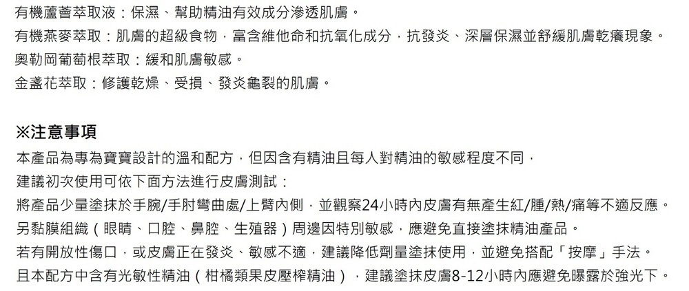 ● 主要成分:有機蘆薈萃取液、有機燕麥萃取、奧勒岡葡萄根萃取、金盞花萃取
