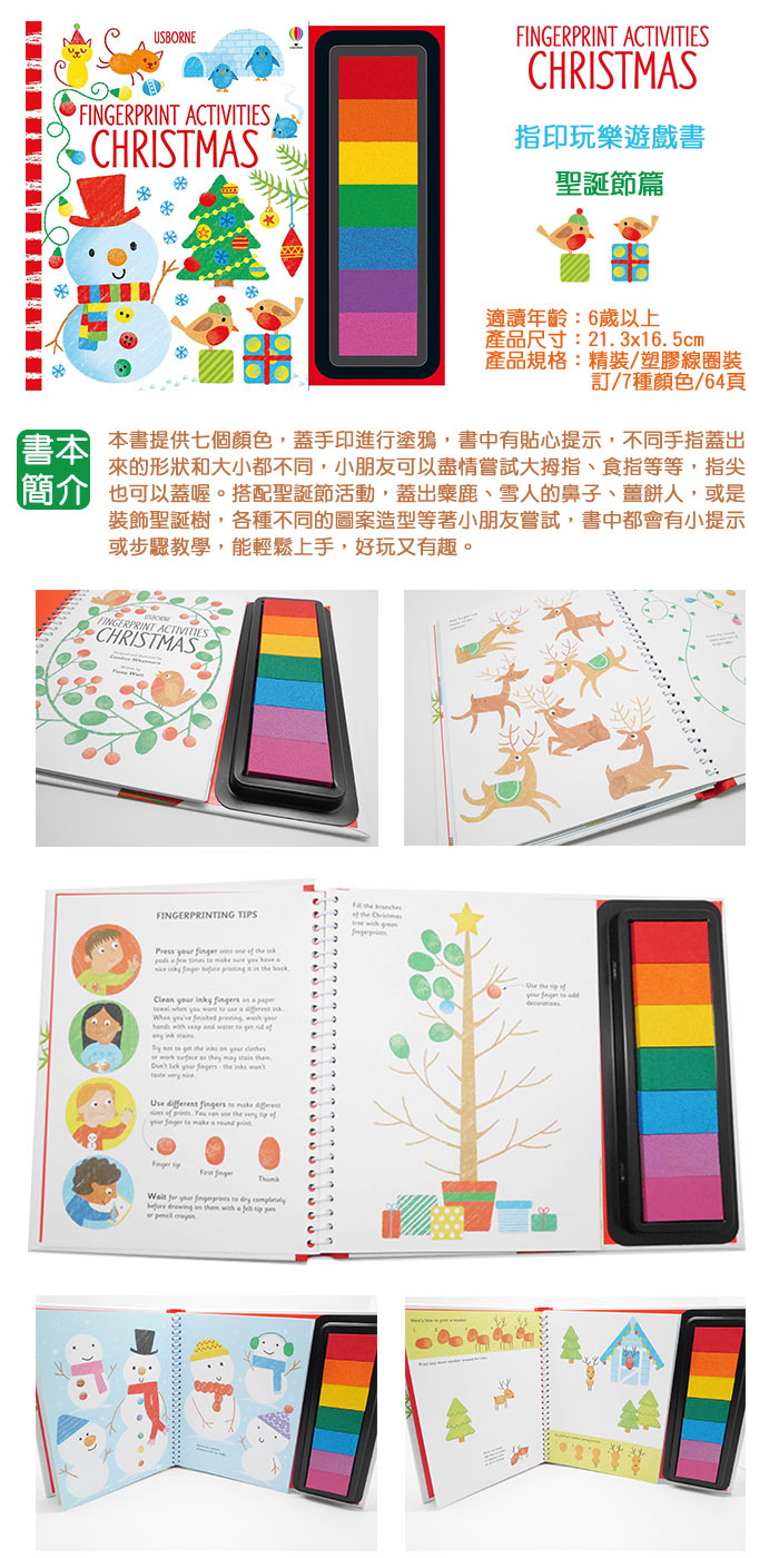 本書利用蓋手印進行創作,7種顏色隨意發揮,按照書中的指示印出節慶的相關事物,讓小朋友激發無限的想像力和創造力,過程中也會對出現的英文單字留下深刻的印象。