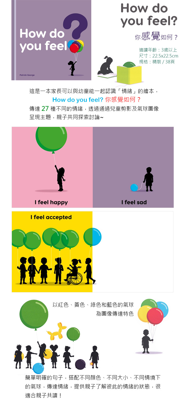 簡單明確的句子,搭配不同顏色、不同大小、不同情境下的氣球,傳達情緒,提供親子了解彼此的情緒的狀態,很適合親子共讀!