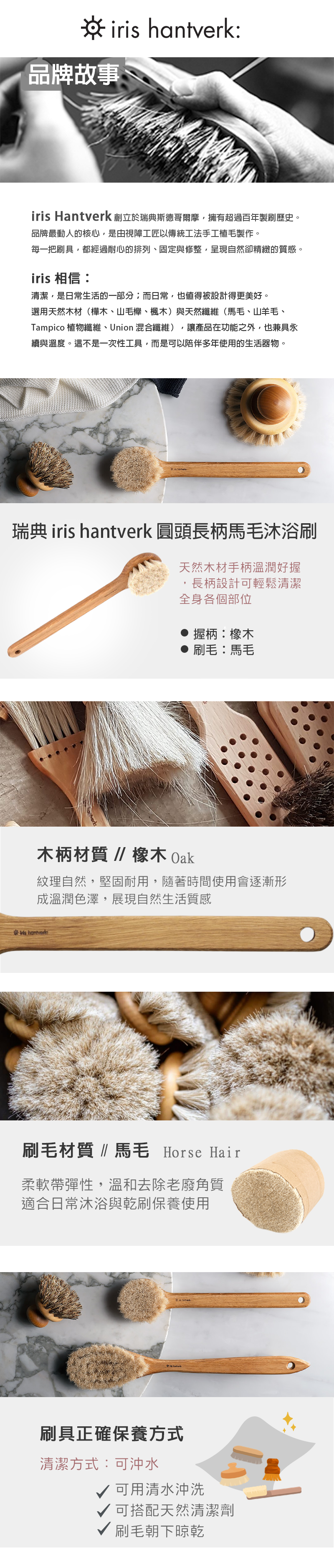 以溫潤橡木與細緻馬毛製成,長柄設計讓背部與難以觸及的部位也能輕鬆清潔。刷毛觸感柔和,溫和去除老廢角質,適合日常沐浴與乾刷保養使用。