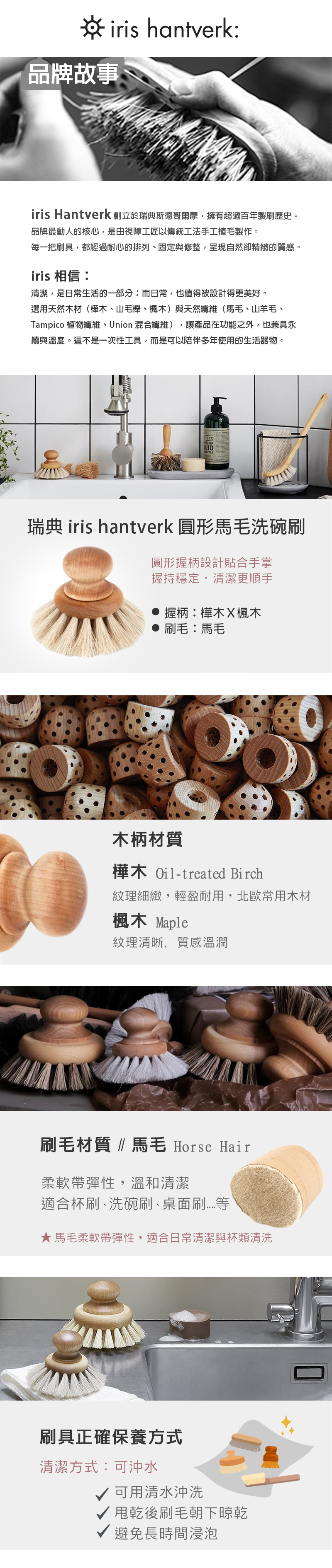 採用天然樺木與楓木手柄,搭配柔韌馬毛刷毛,圓形刷頭設計握感舒適,方便清潔杯子、鍋具及水槽容器,小巧輕盈,適合日常廚房使用。