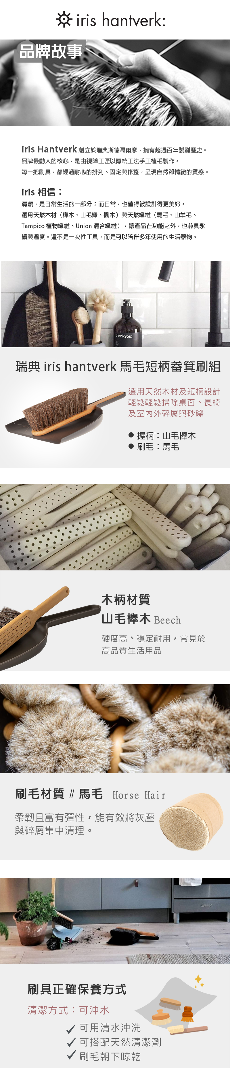 天然馬毛搭配塗油山毛櫸木手柄,短柄設計方便握持,附石墨黑畚箕,輕鬆掃除桌面、長椅及室內外碎屑與砂礫。