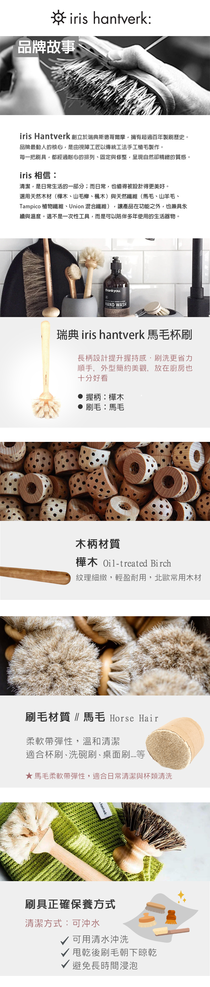 採用天然樺木手柄搭配柔韌馬毛刷毛,圓形刷頭設計特別適合清潔玻璃杯與各類杯具,深入杯底不留死角。簡約北歐風外觀,擺放在水槽旁也充滿質感。