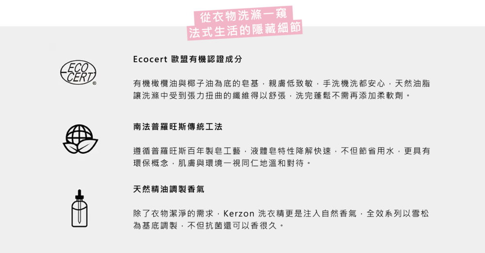● ECOCERT歐盟有機認證天然成分● 南法傳統製皂工藝,不含防腐劑、螢光劑、無石化製品成份● 不須額外添加柔軟精● 適合孕婦與寶寶的天然配方● 天然精油調製香氣,讓不同的洗衣情境更加療癒