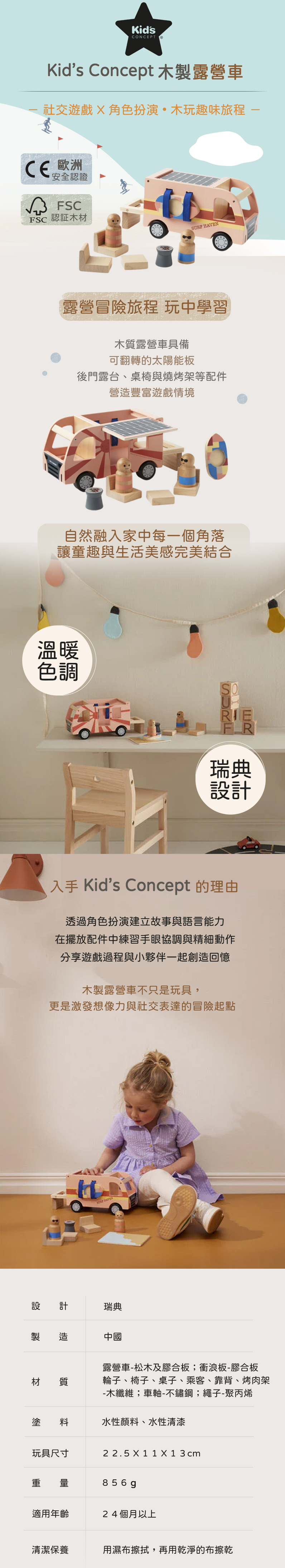 材質:露營車-松木、膠合板/衝浪板-膠合板/輪子、椅子、桌子、乘客、靠背、烤肉架-木纖維/車軸-不鏽鋼/繩子-聚丙烯