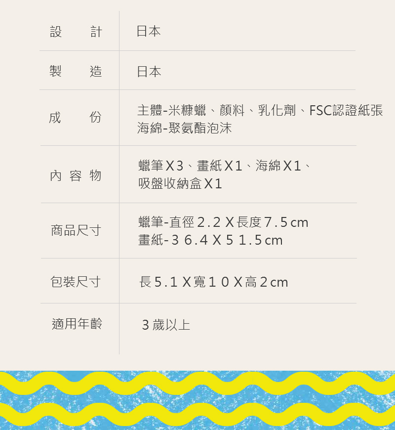 內容物:蠟筆x3、畫紙x1、海綿x1、吸盤收納盒x1