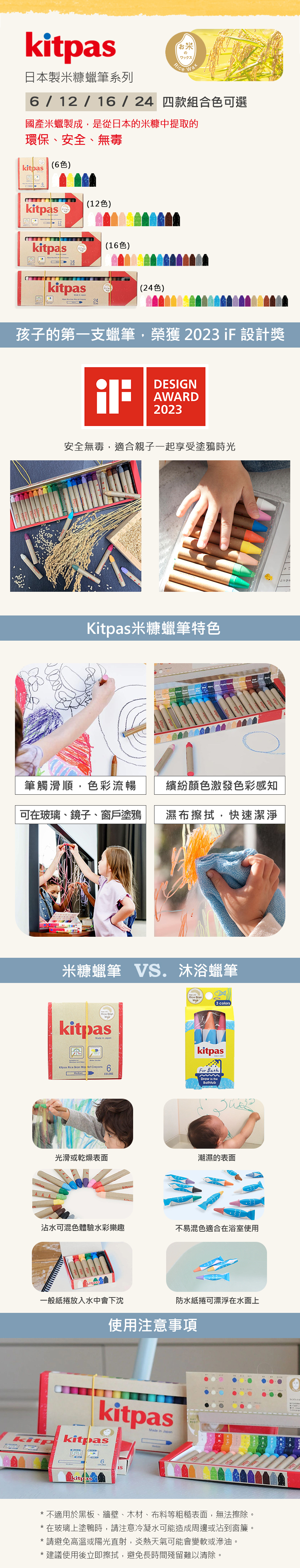 完整色系,滑順好畫又顯色,可輕鬆擦拭,環保無毒,爸媽放心,也常被稱為米蠟筆。與水混合可以製成水彩。