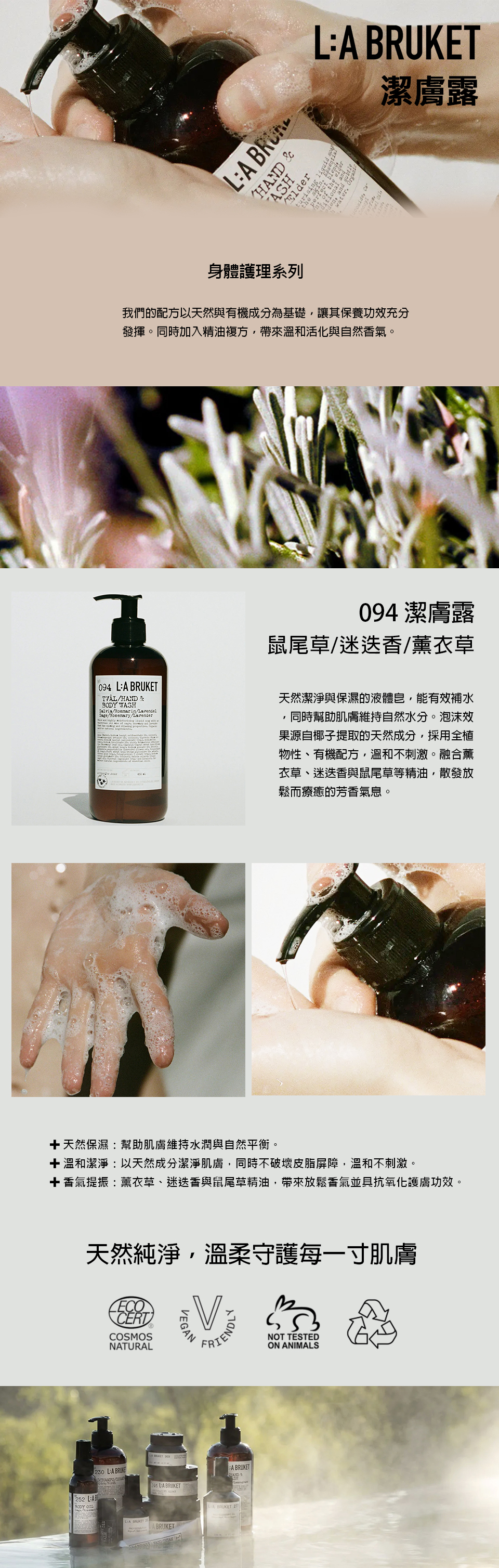 成份溫和且高度保濕的天然液態潔膚露,可輕柔清潔與滋潤身體與手部肌膚,添加天然精油有效保濕肌膚。使用後潤澤舒適。