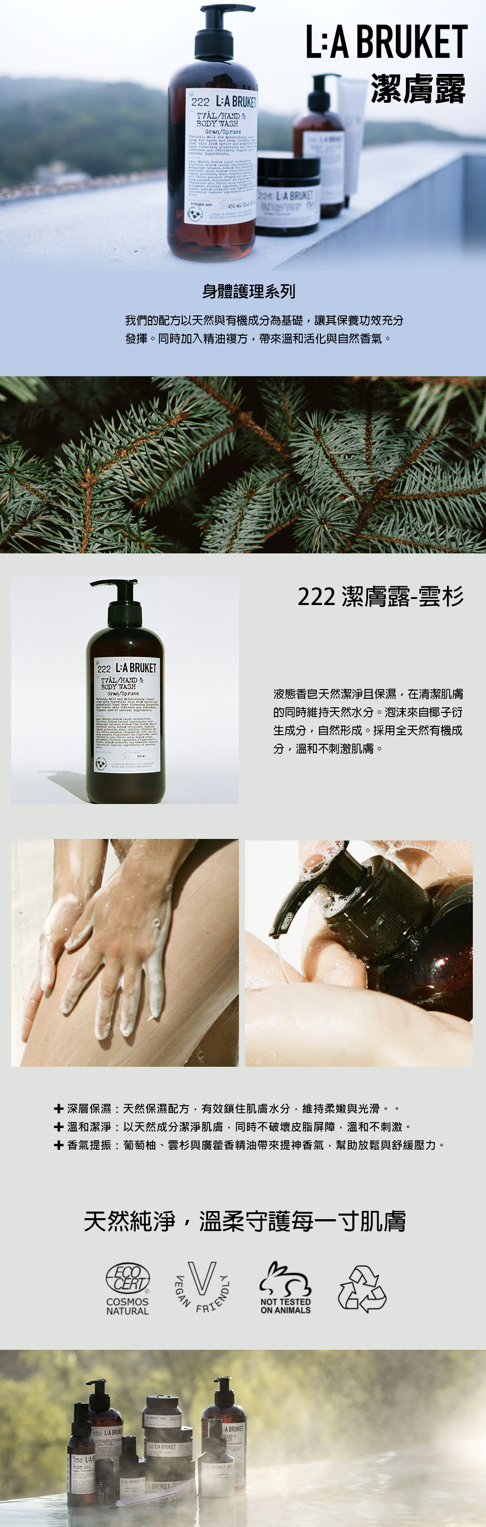 成份溫和且高度保濕的天然液態潔膚露,可輕柔清潔與滋潤身體與手部肌膚,添加天然精油有效保濕肌膚。使用後潤澤舒適。