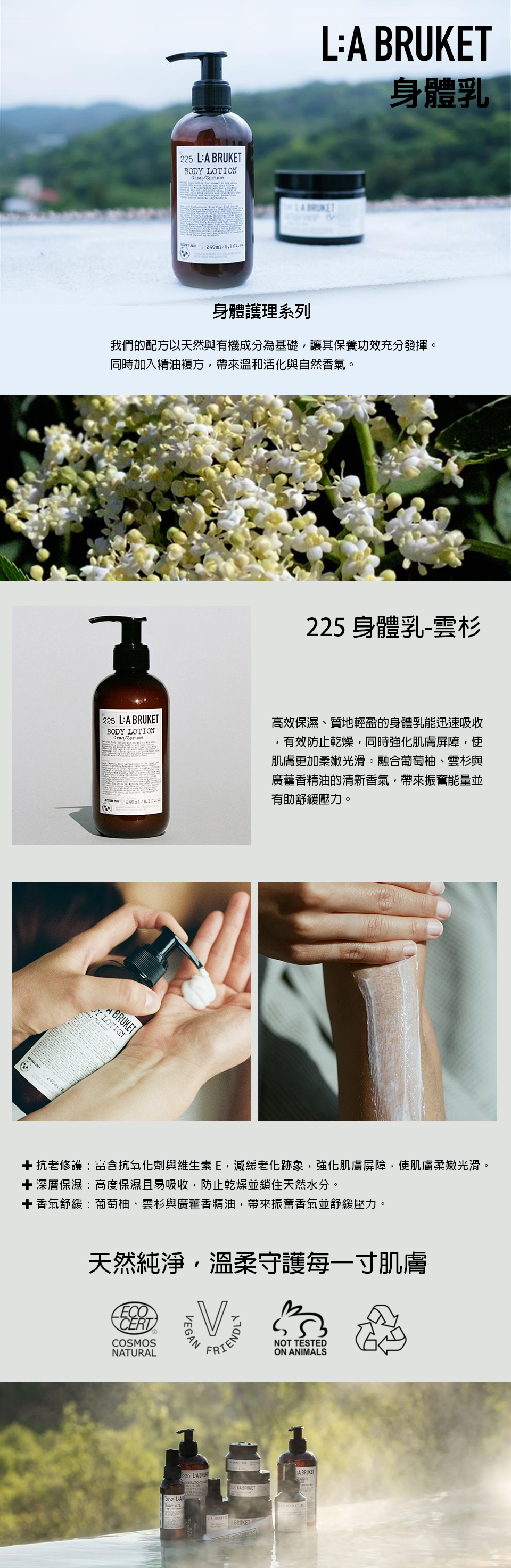 清爽的身體乳液易於吸收,可防止皮膚乾燥。 包含乳木果油、椰子油和可可脂以及天然精油成分,質地清爽不黏膩,顛覆你對身體乳的既定印象。雲杉:來自北歐森林的清新開闊氣息。