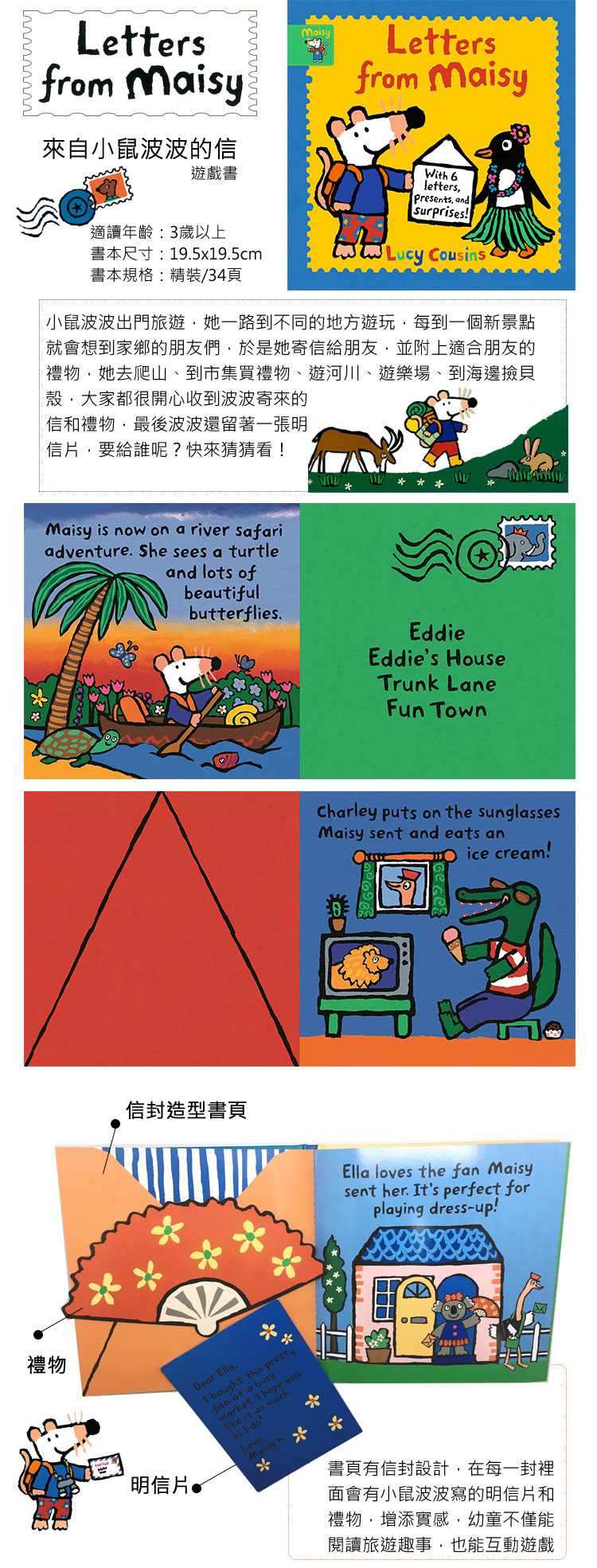精彩的故事書中附上信封,裡面會有小鼠波波旅遊時寫的明信片和禮物,與朋友們分享,主題設計豐富有趣,適合3歲以上的小朋友閱讀把玩。