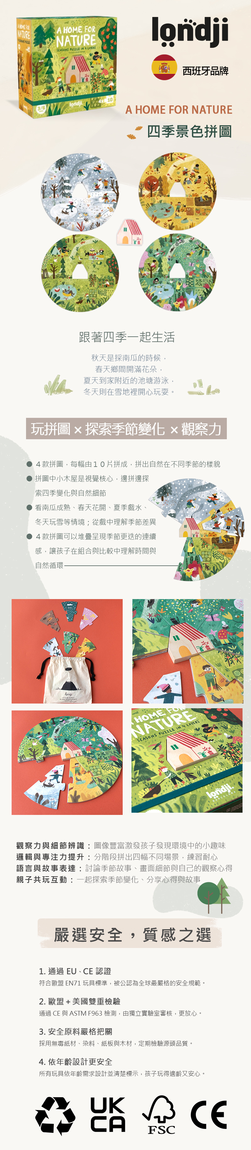 4幅圓形圖畫呈現四季景緻,各由10片拼圖組成,在中心位置設計有一個小木屋,以我們的家為概念,玩家在遊戲過程裡,發現大自然在每個季節中的變化。