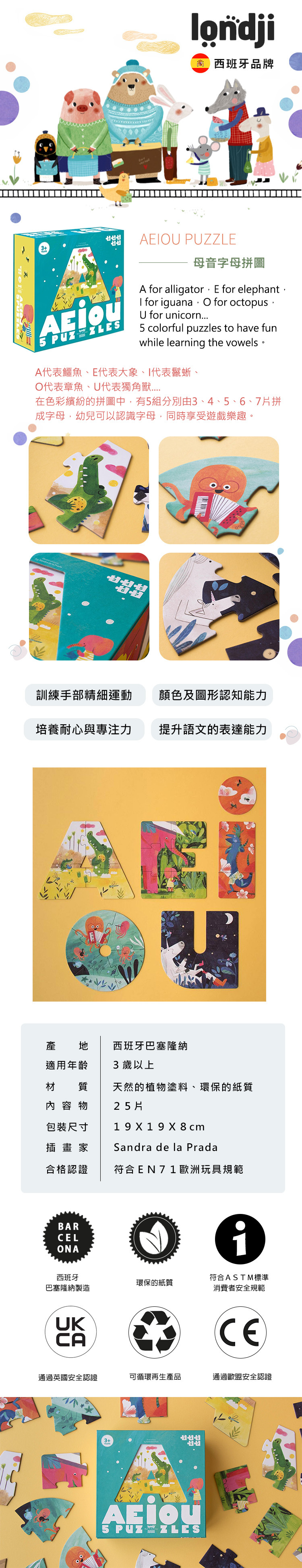 AEIOU字母造型,可在拼圖過程中學習母音,搭配精美動物插圖加深印象,充滿藝術感的拼圖圖案,是大人小孩都會喜歡的拼圖,抽屜式紙盒便於收納,很適合親子一起完成共享快樂時光。