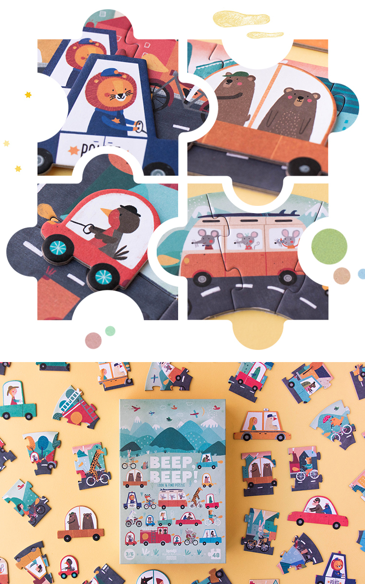 小心開車的駕駛、快樂出遊的單車騎士和載滿冰淇淋的卡車,路上有數不盡的有趣車子!拼圖組合完成後,就能盡情觀察拼圖中的人物。快來看看誰能最先找到10位駕駛?