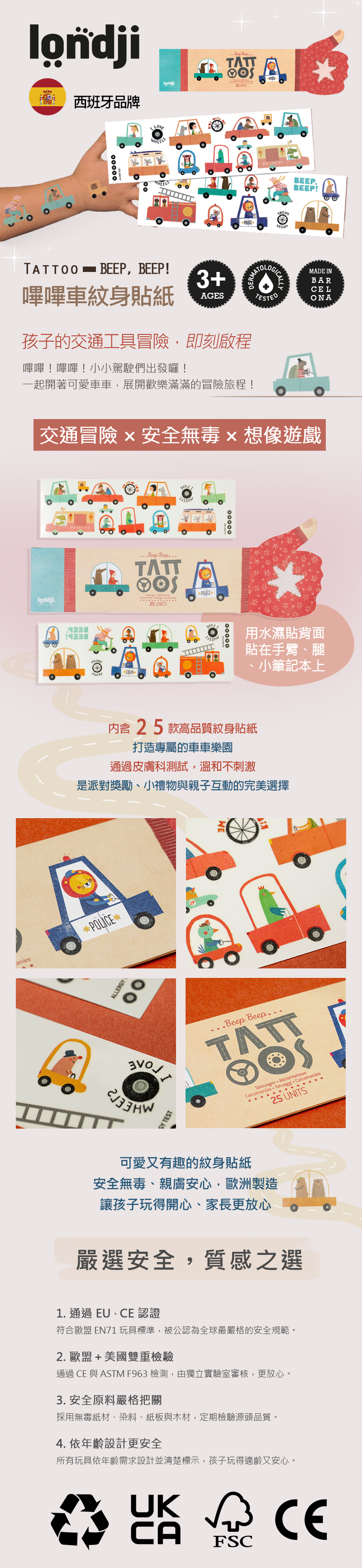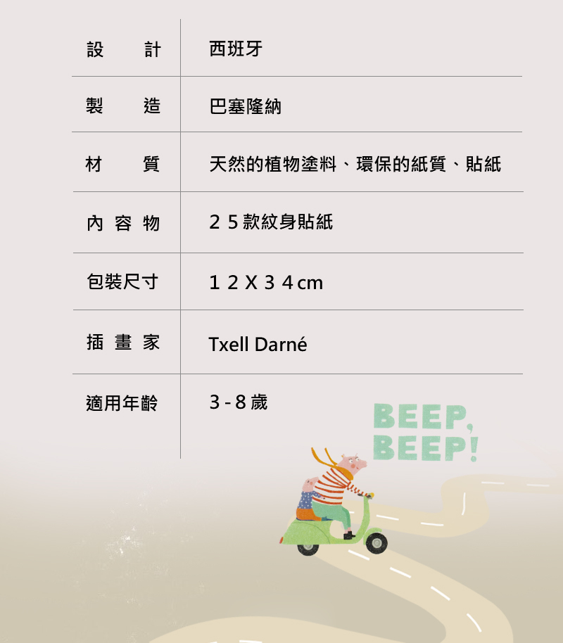 專為小小孩設計的紋身貼紙,小小一張,就是孩子的大大驚喜。可愛的嗶嗶車一貼上手,馬上啟動想像力,開車出發去冒險!