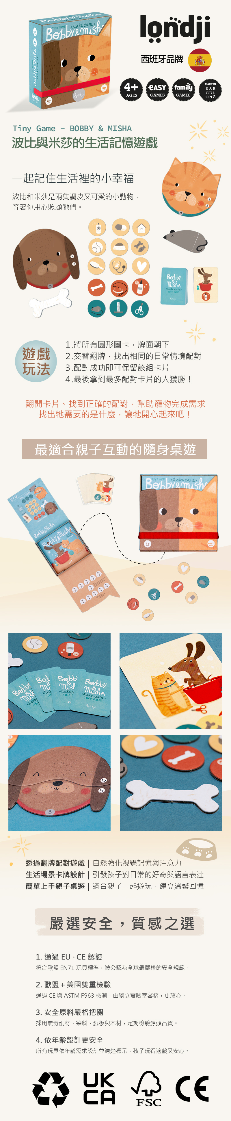 波比與米莎,是一隻調皮的小狗與小貓,翻開卡牌、找到正確的照顧圖卡,幫助牠們完成日常小任務,慢慢累積幸福感。