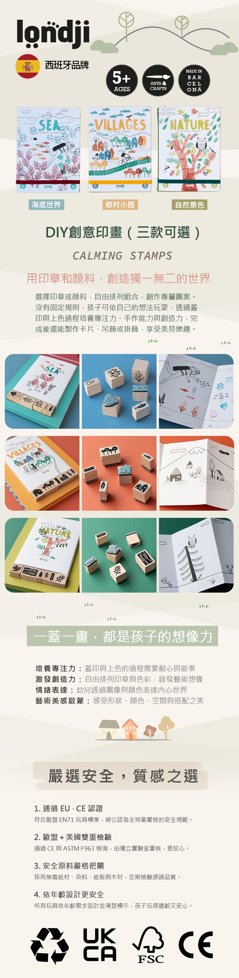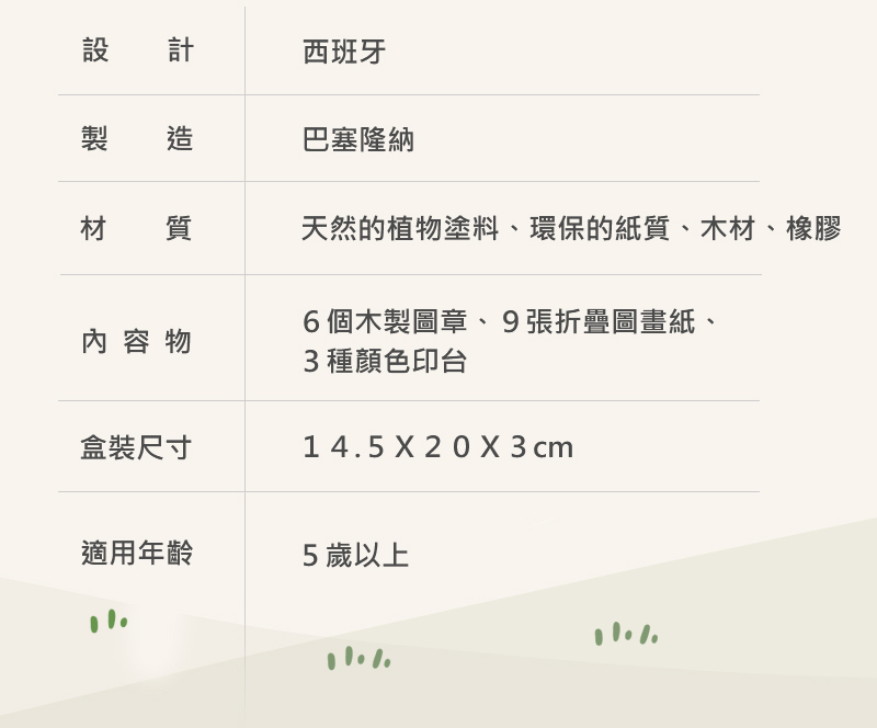 內容物:6個木製圖章、9張折疊圖畫紙、3種顏色印台