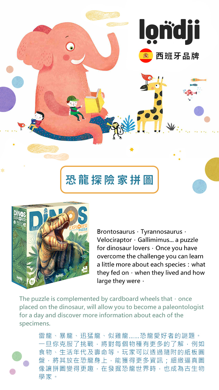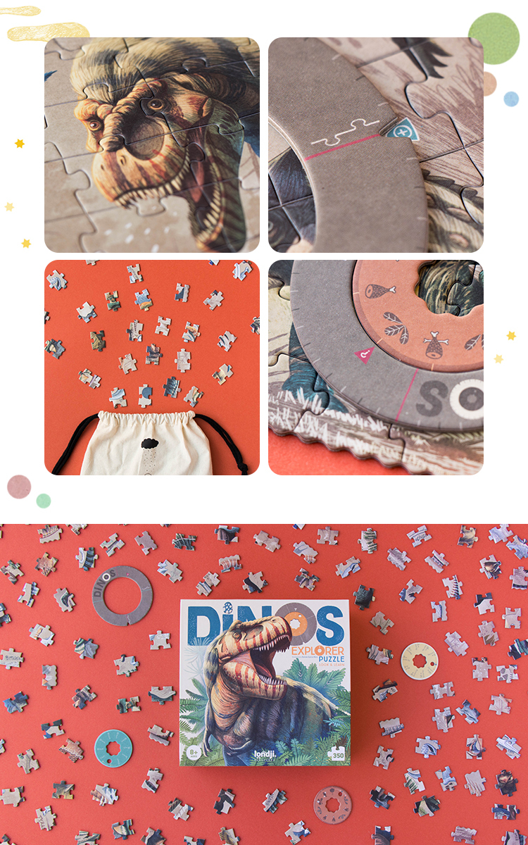 一次擁有雷龍、暴龍、迅猛龍和似雞龍,十分適合恐龍迷的拼圖。完成拼圖後,還能瞭解各品種的相關知識,例如食物、生活年代和壽命。