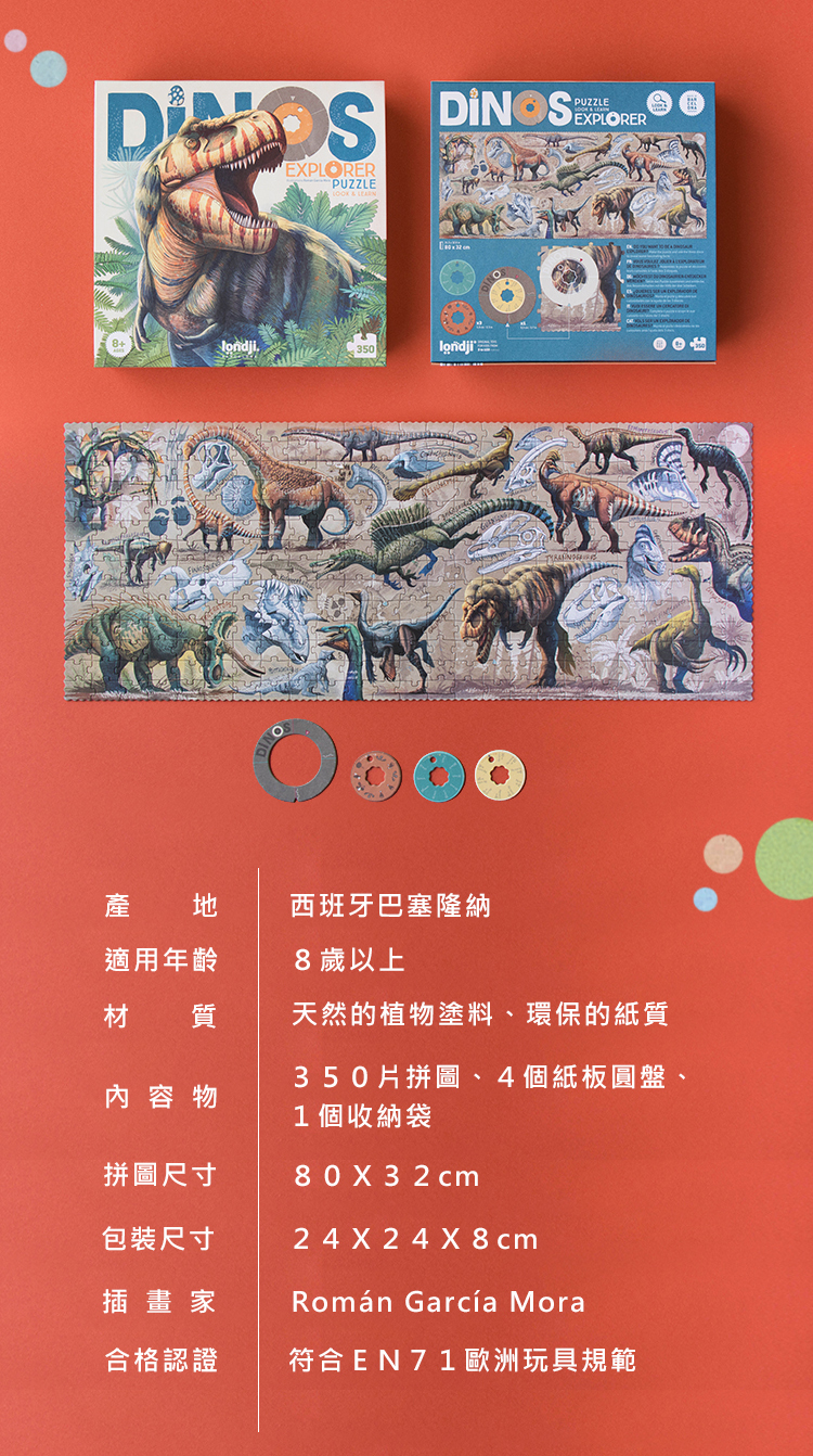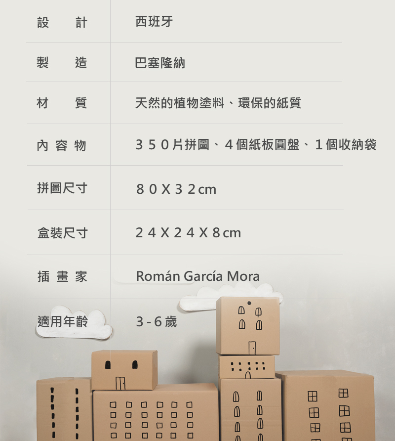 內容物:350片拼圖、4個紙板圓盤、1個收納袋