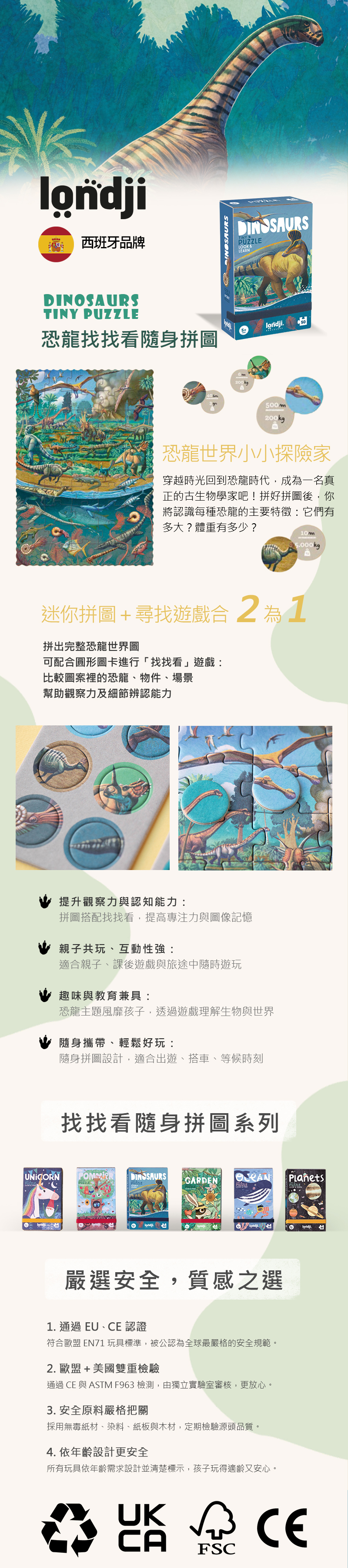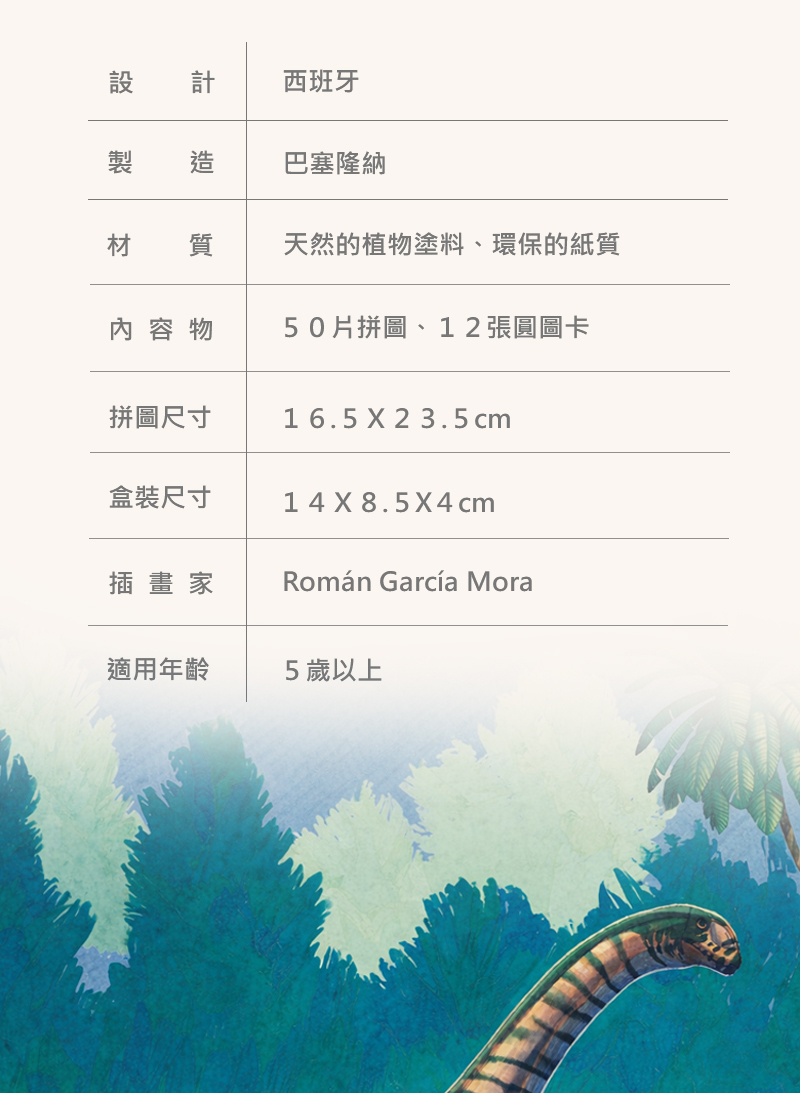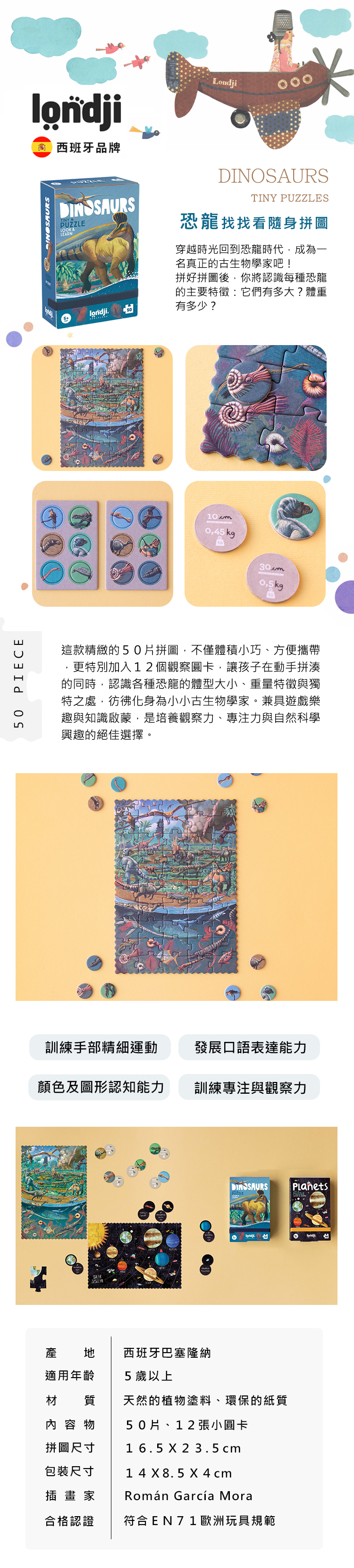 50片拼圖搭配12片觀察遊戲,從中學習恐龍知識。