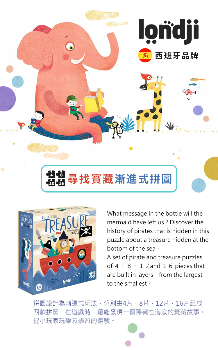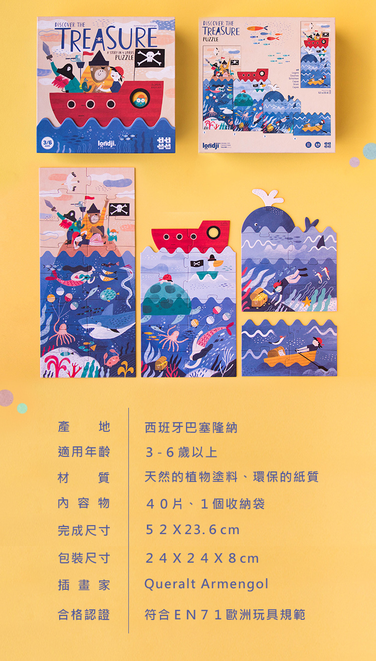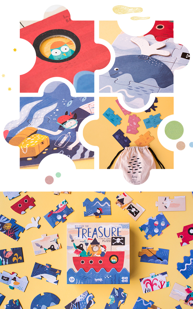 共有4組拼圖,分別由4個,8個,12個,16個拼圖組成,從大到小分層組裝,同時發現一個隱藏在海底的寶藏故事。