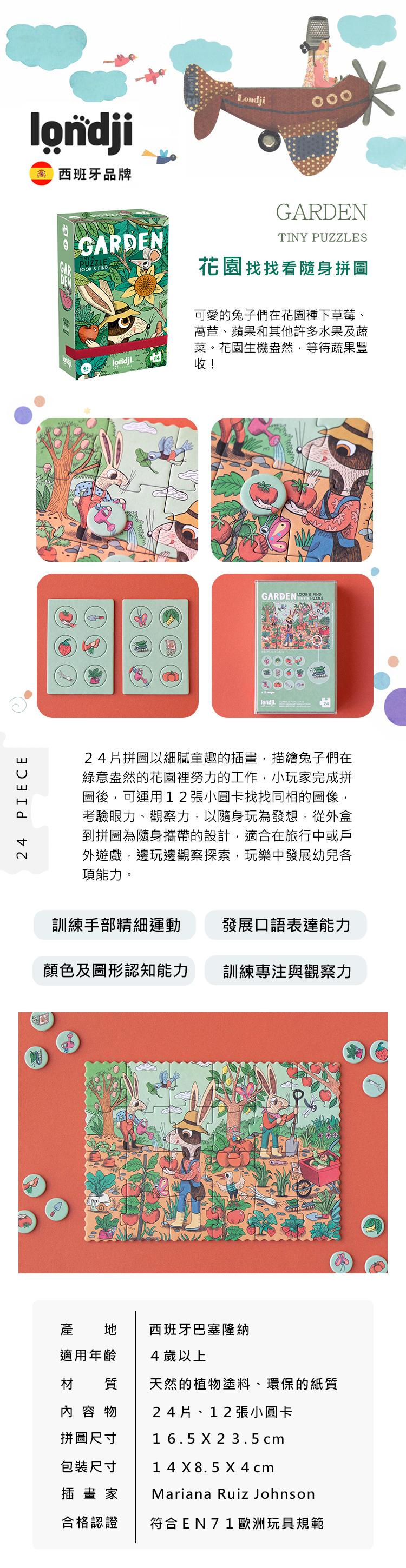 24片拼圖搭配觀察遊戲,拼好後在整副圖中尋找12個圖案,激發對花園和蔬果的探索興趣。