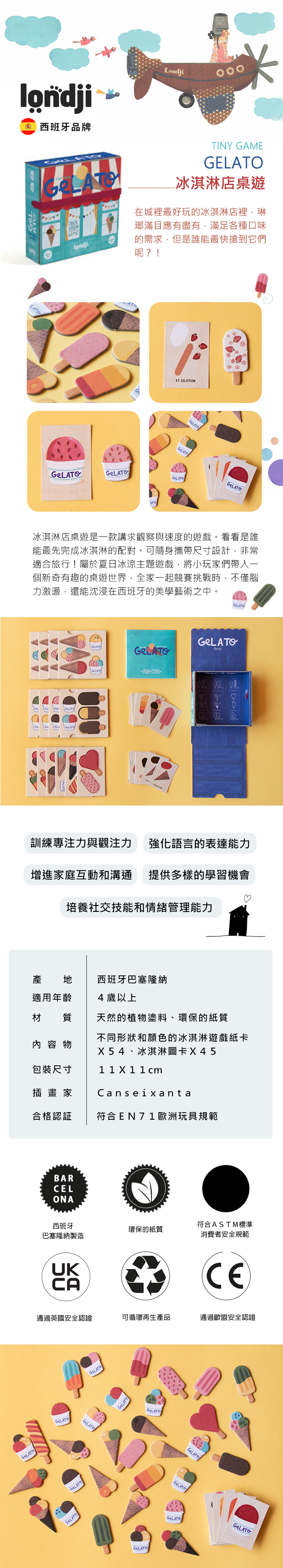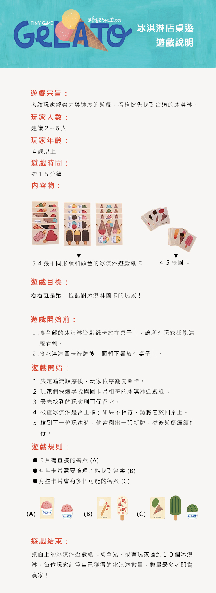 內容物:45張冰淇淋圖卡、54張不同形狀和顏色的冰淇淋遊戲紙卡