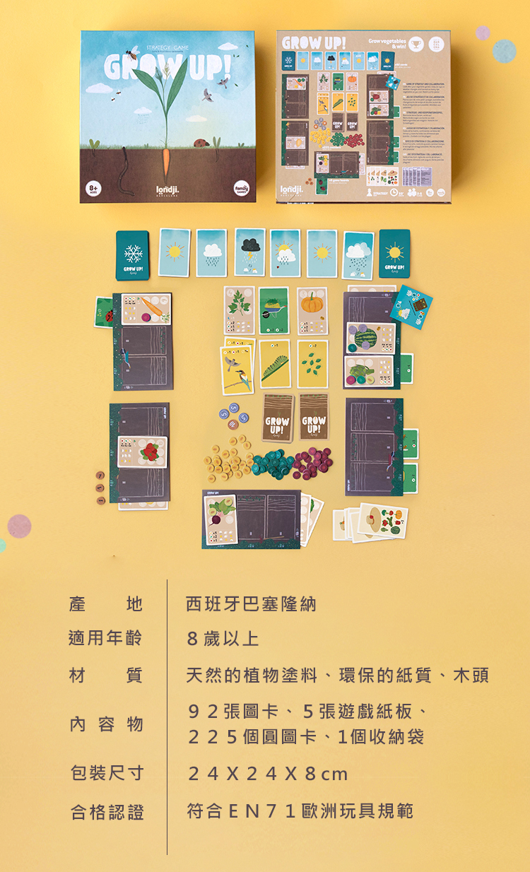 內容物:92張圖卡、5張遊戲紙板、225個圓圖卡、1個收納袋