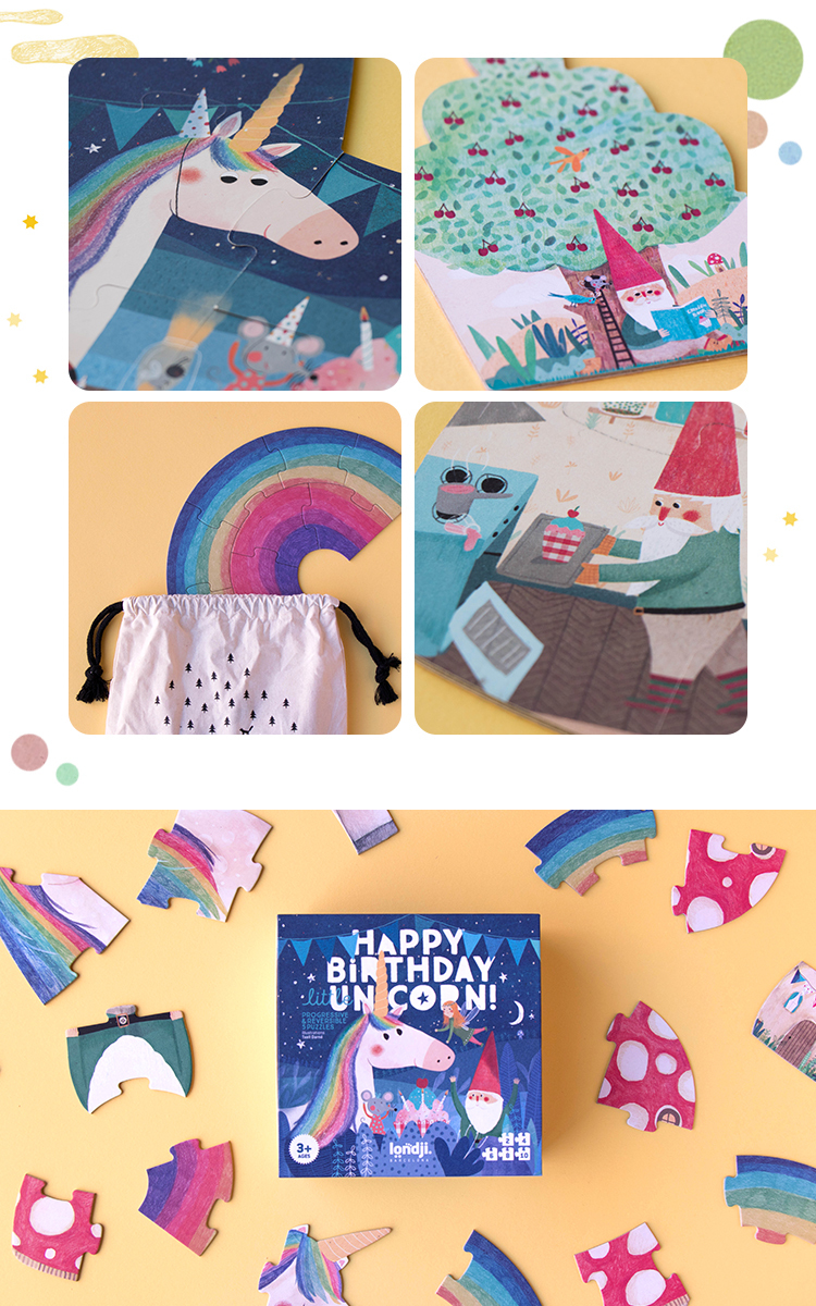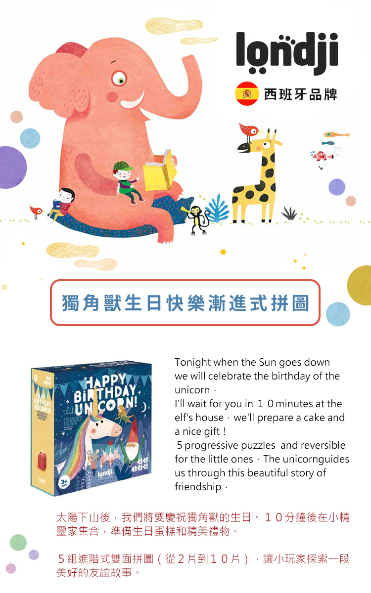 5組進階式雙面拼圖(從2到10片),供幼童探索一段美好的友誼故事。