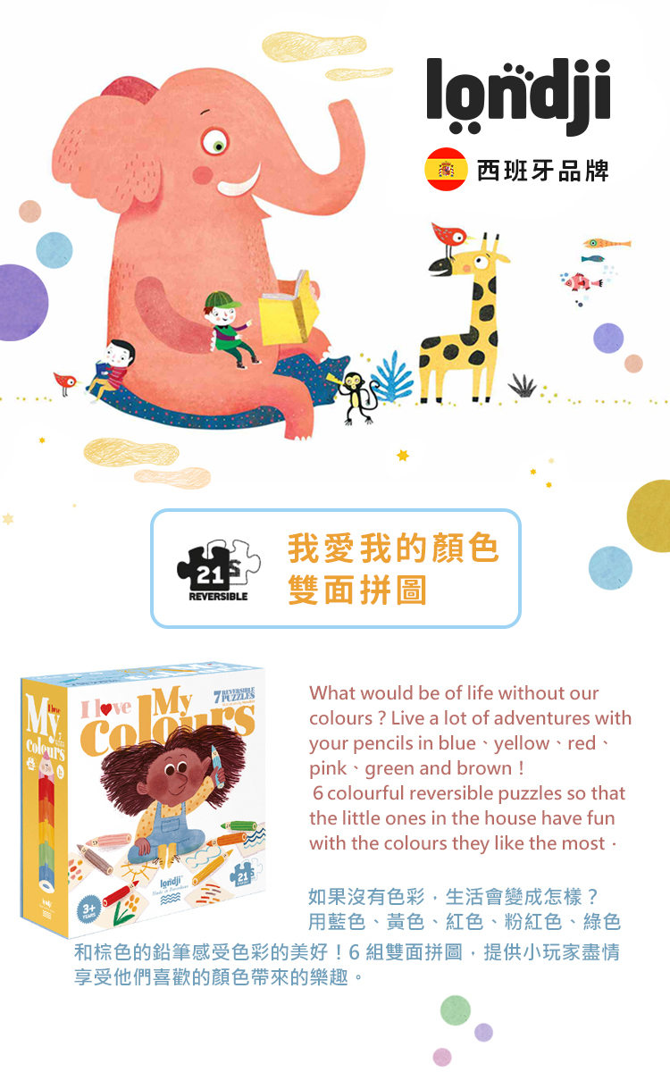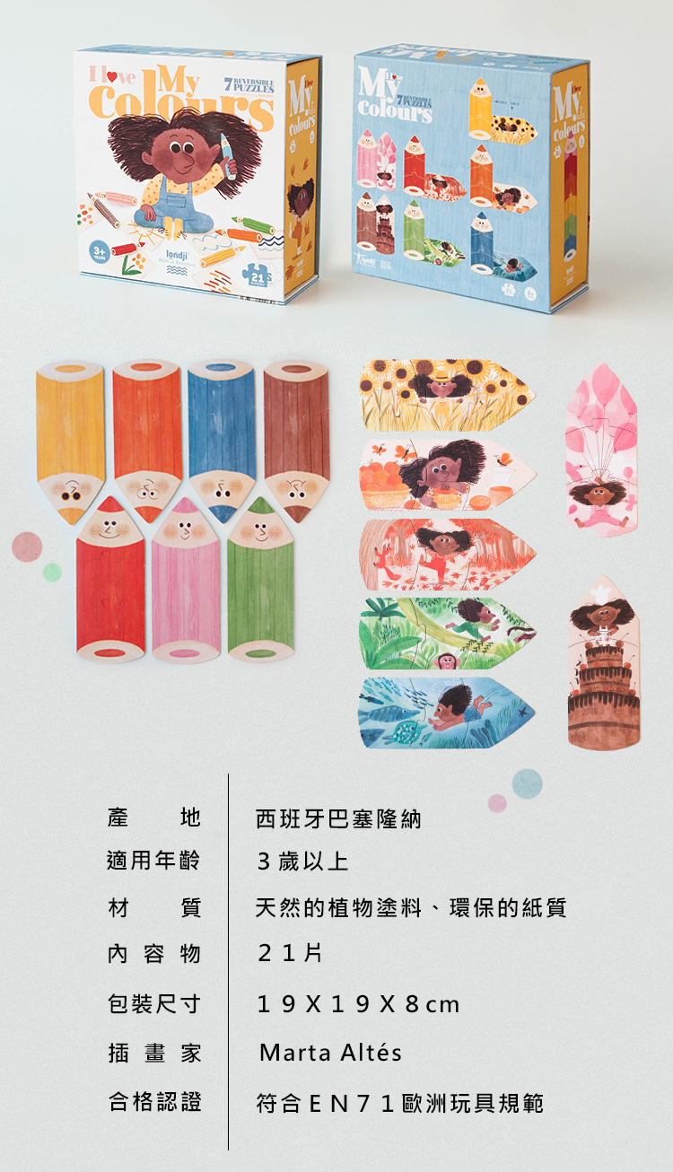 生活中沒有色彩該怎麼辦呢?使用彩色筆做些好玩的事情吧!不管是藍色、黃色、紅色、粉紅色、綠色或棕色,都能讓生活更有趣! 7組雙面拼圖,小朋友能盡情使用最愛的顏色玩耍。