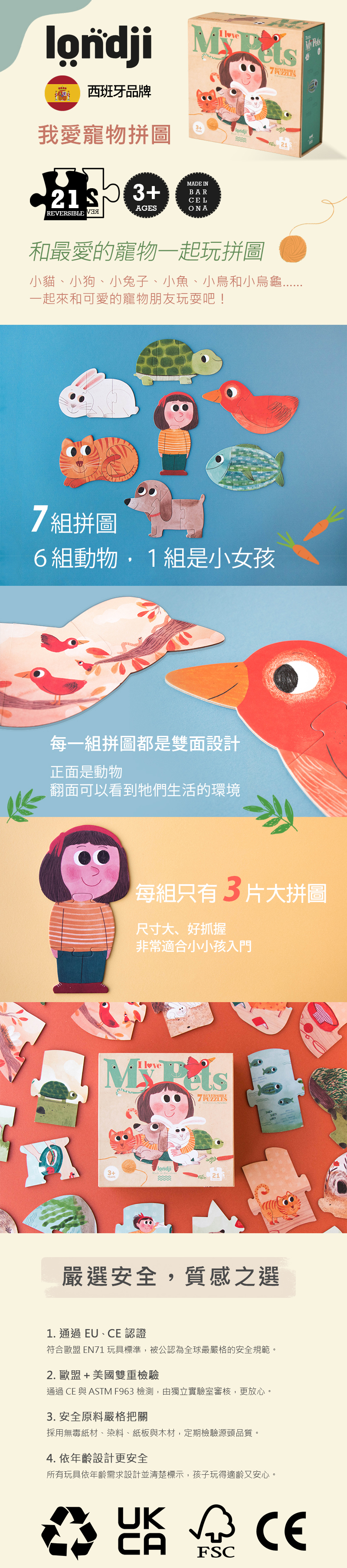 六隻動物分別有三片拼圖組成,雙面印刷提供豐富多樣的內容,充滿藝術感的拼圖圖案,是大人小孩都會喜歡的拼圖,抽屜式紙盒便於收納,很適合親子一起完成共享快樂時光。
