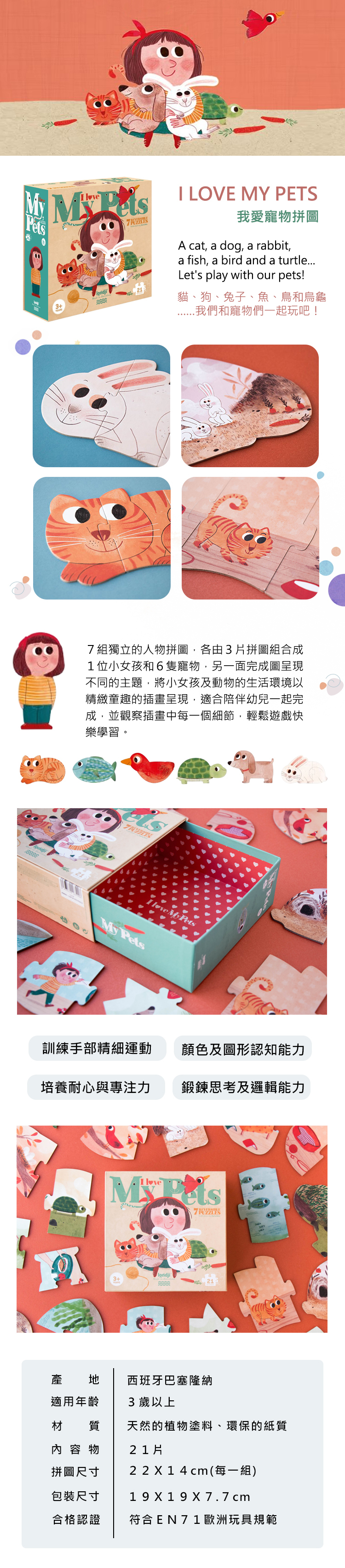 六隻動物分別有三片拼圖組成,雙面印刷提供豐富多樣的內容,充滿藝術感的拼圖圖案,是大人小孩都會喜歡的拼圖,抽屜式紙盒便於收納,很適合親子一起完成共享快樂時光。