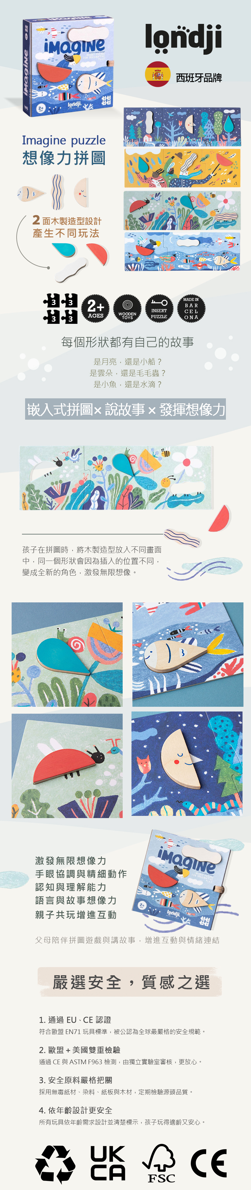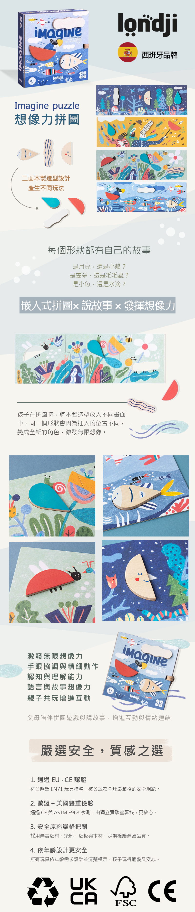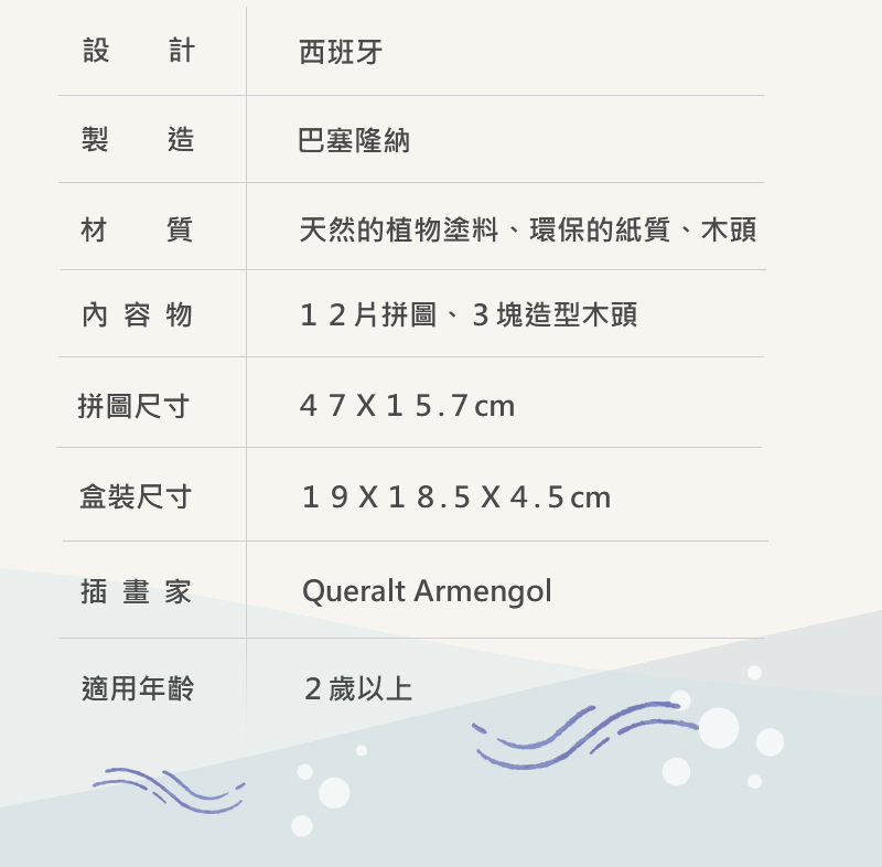 優美精緻的圖畫變成了拼圖,還有三塊形狀木片穿梭在其中,可能是月亮、小船、雲、毛毛蟲,還是魚或水滴,生動豐富了整個場景。