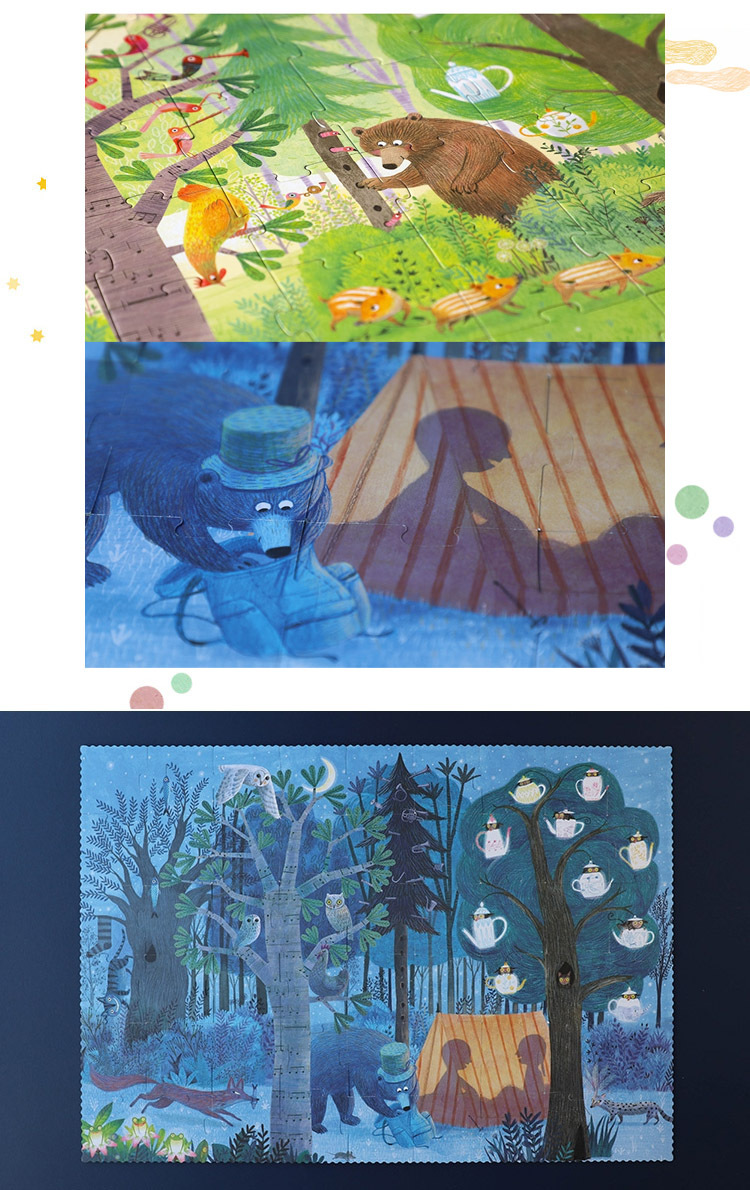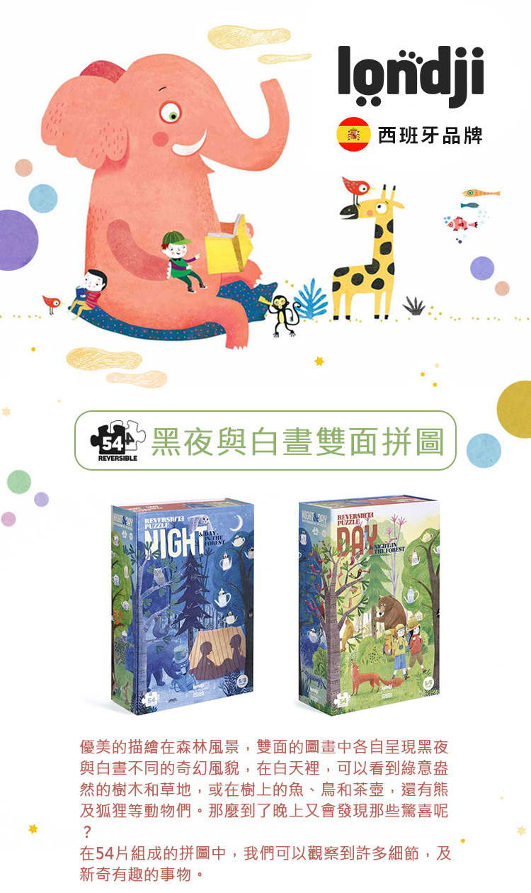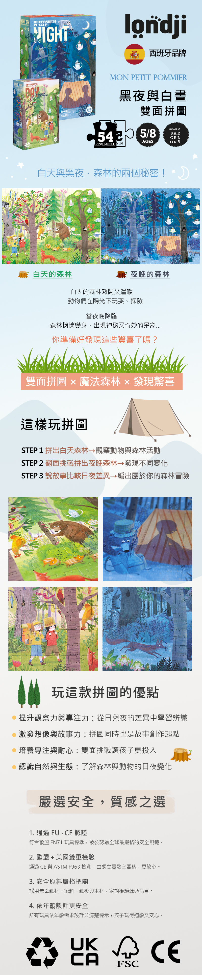 拼圖的畫面以自然風光爲題材,且設計成雙面皆有圖案,呈現黑夜與白晝的主題,繪圖豐富具藝術感,是大人小孩都會喜歡的拼圖,抽屜式紙盒便於收納,很適合親子一起完成共享快樂時光。