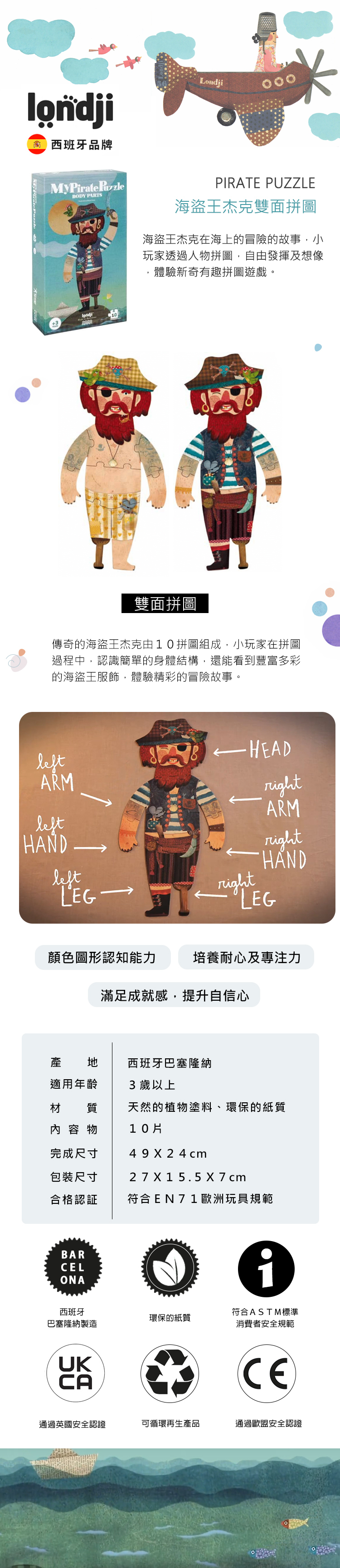 簡單的人物造型拼圖,雙面圖案的設計,在拼圖中可以認識人體結構也可以說個和海盜杰克有關的小故事,讓拼圖過更活潑生動。
