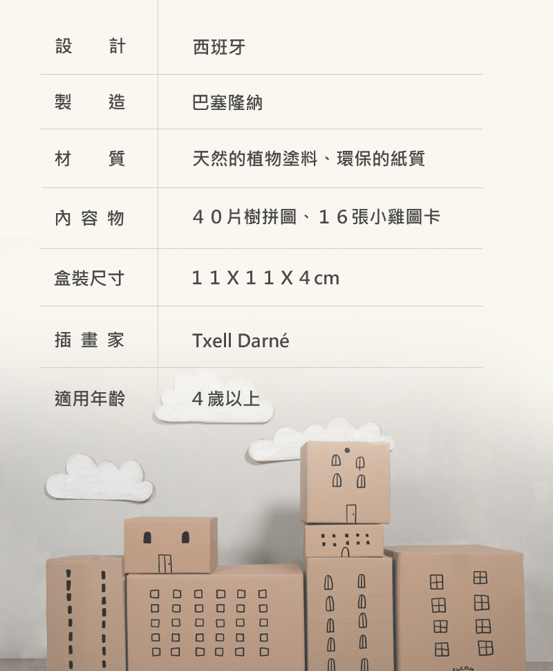 內容物:40片樹拼圖、16個小雞圖卡