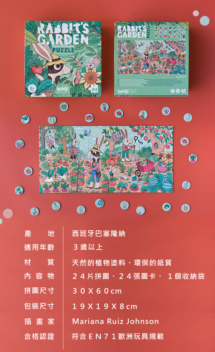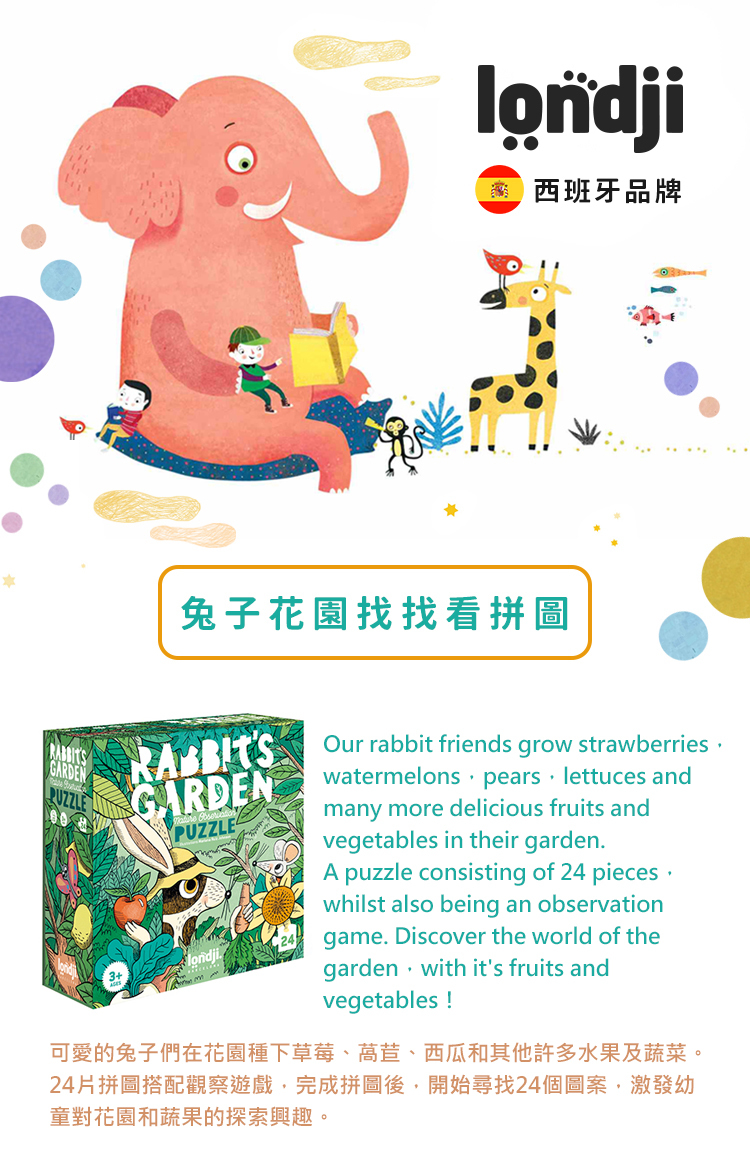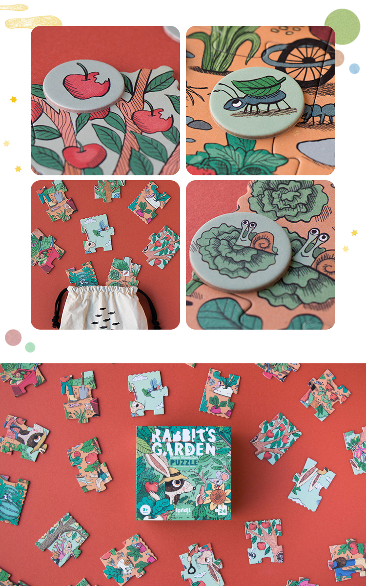 24片拼圖搭配觀察遊戲,拼好後能整副圖中尋找24個圖案,激發對花園和蔬果的探索興趣。