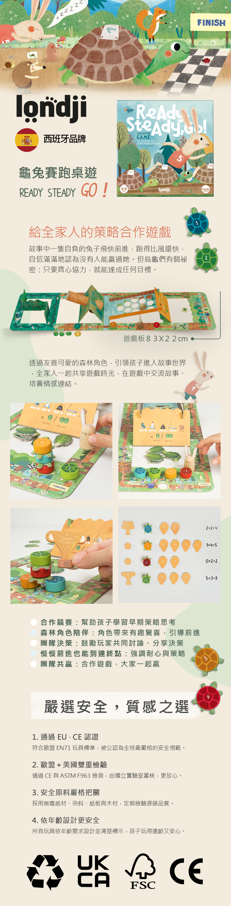 內容物:木頭野兔x1、木頭烏龜x4、木球x1、遊戲板(83x22cm)x1、萵苣x20、紅蘿蔔x1、野兔x1、獎品x4